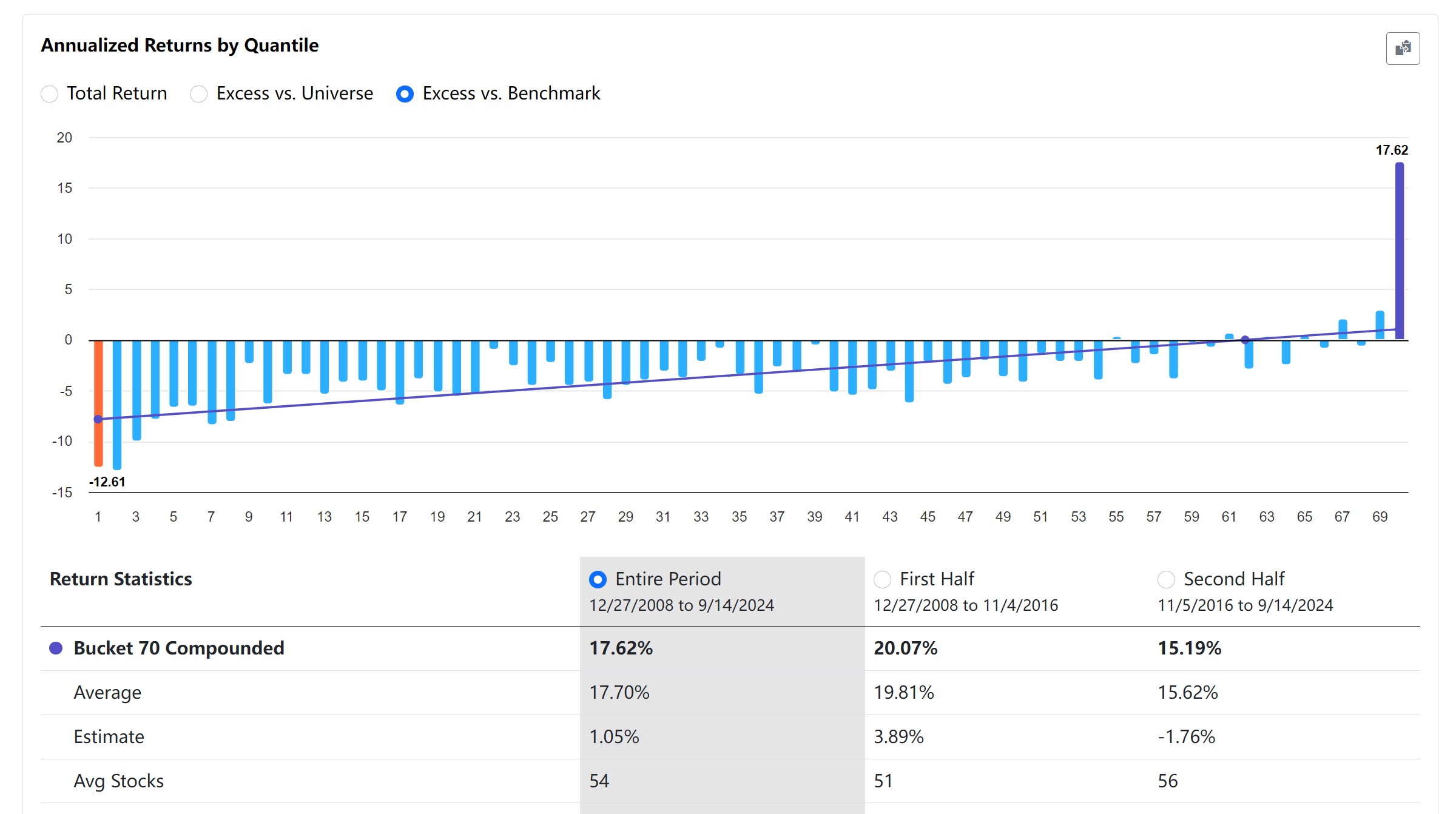 - Rank(排名系统)显示,持有前50个股票的年化Alpha有17.62%