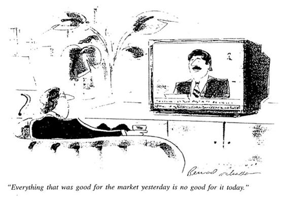 市场波动于其最易变的参与者的一时兴起:他们愿意(a)在消息很好且狂热高涨的时候,以较之前价格的一个高溢价买入,以及(b)在消息很糟且悲观情绪弥漫的时候,以较之前价格的一个大折扣卖出。因此,正如我在《在沙发上》中所写的,每隔一段时间,市场就需要去看一趟心理医生。