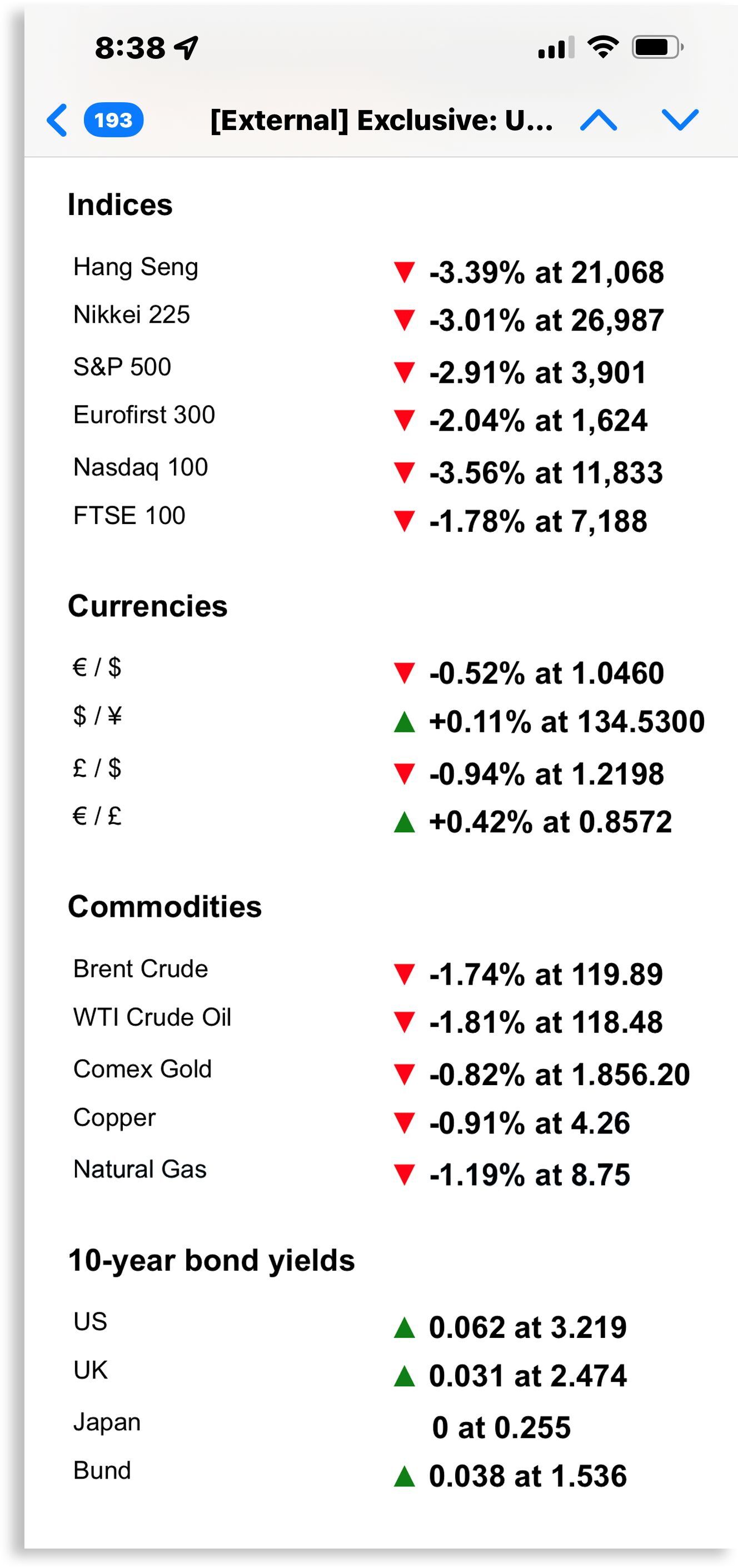 这是市场上艰难的一天:由于美联储和其他央行的行动,利率在上升,于是资产价格因此承受着巨大压力。但是看看这张表。所有国家的股指都大幅下跌。每种货币相对于美元都下跌了。所有大宗商品都在下跌。只有一样事物是上升的:债券收益率……这意味着债券价格也在下跌。就没有一种资产或一个国家的价值那天没下跌的吗?黄金怎么样,人们认为黄金在困难时期应该表现良好?我这里的观点是,在市场大幅波动期间,没有人进行理性分析或做出区分。他们只是把婴儿和洗澡水一起倒掉,主要因为心理摆动。正如那句老话说的,“在危机时刻,所有相关性都到1。”
