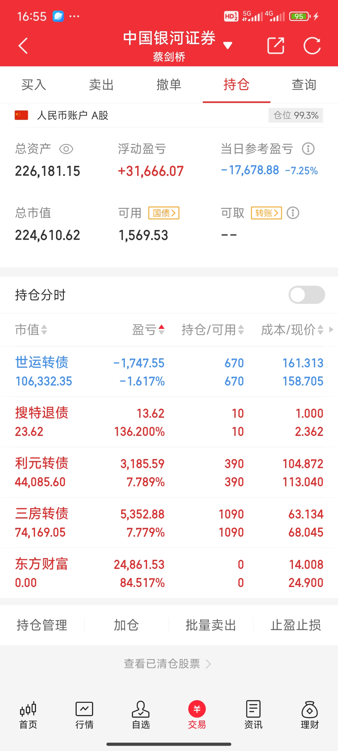 现在我知道天23转债大概率一满足就马上强赎的了。那么接下来数日子就很关键。天合光能企图发利好尽快凑足15天,结果今天被大盘和行业走势压制,最终还是收在20.8之下。后面几个交易日,必须逢高减仓了。持仓均下跌,亏麻了。什么时候才能涨回来。难受。买50张鹰19压压惊。满仓死扛中。