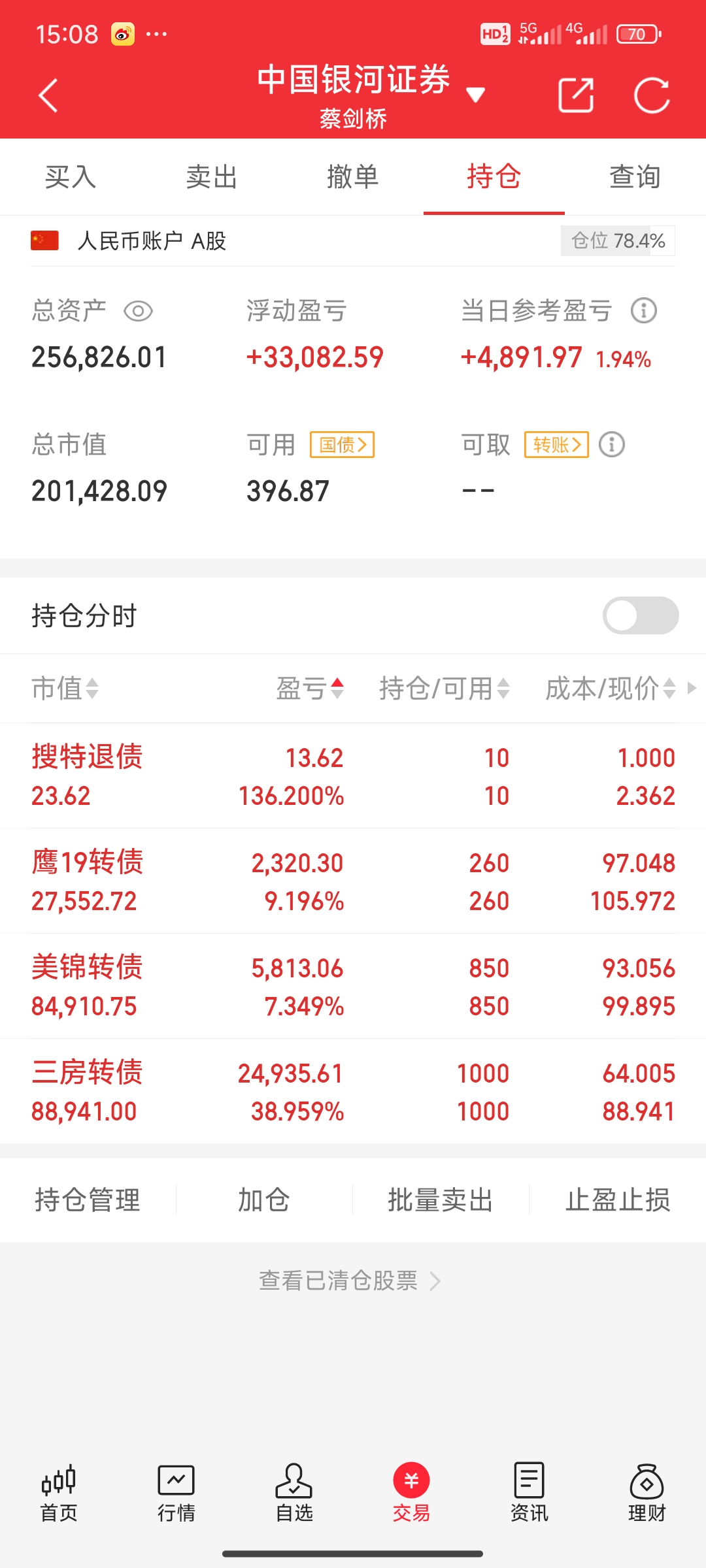 加仓了天23,双良转债,买了200张中路转债。今日亏损5000左右,仓位80%。震荡下行的行情,应该是要逢高减仓?
