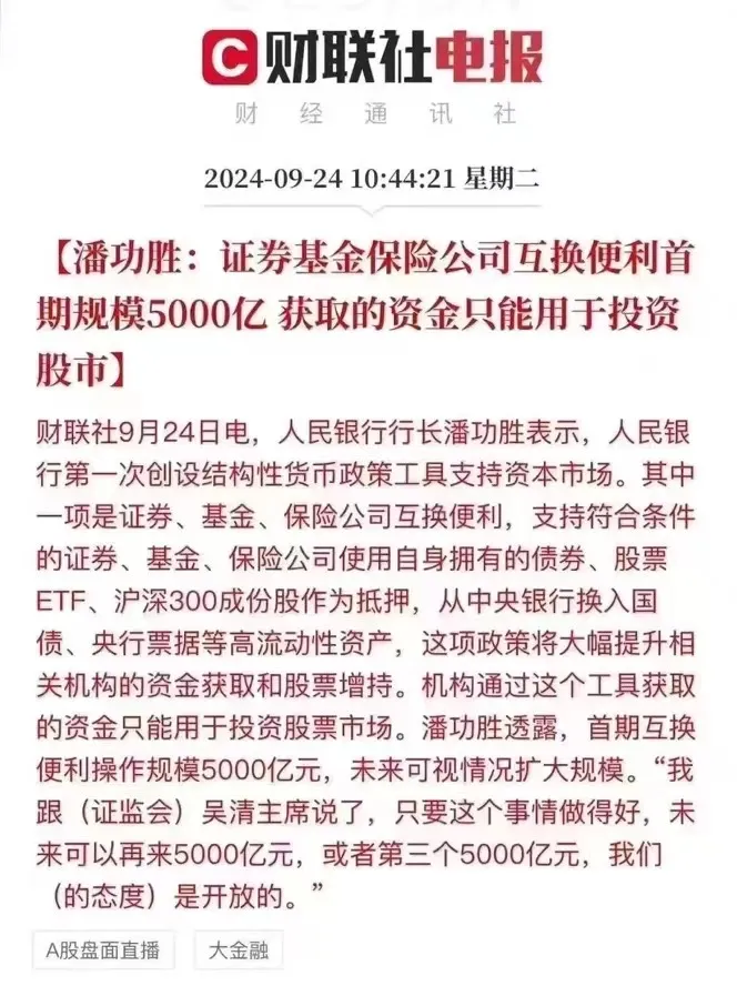 允许证券、基金、保险公司通过抵押自己的资产找央行换入流动性资产投资股票了,并且潘行长透露了首期是5000亿,以后还有第二个第三个5000亿。