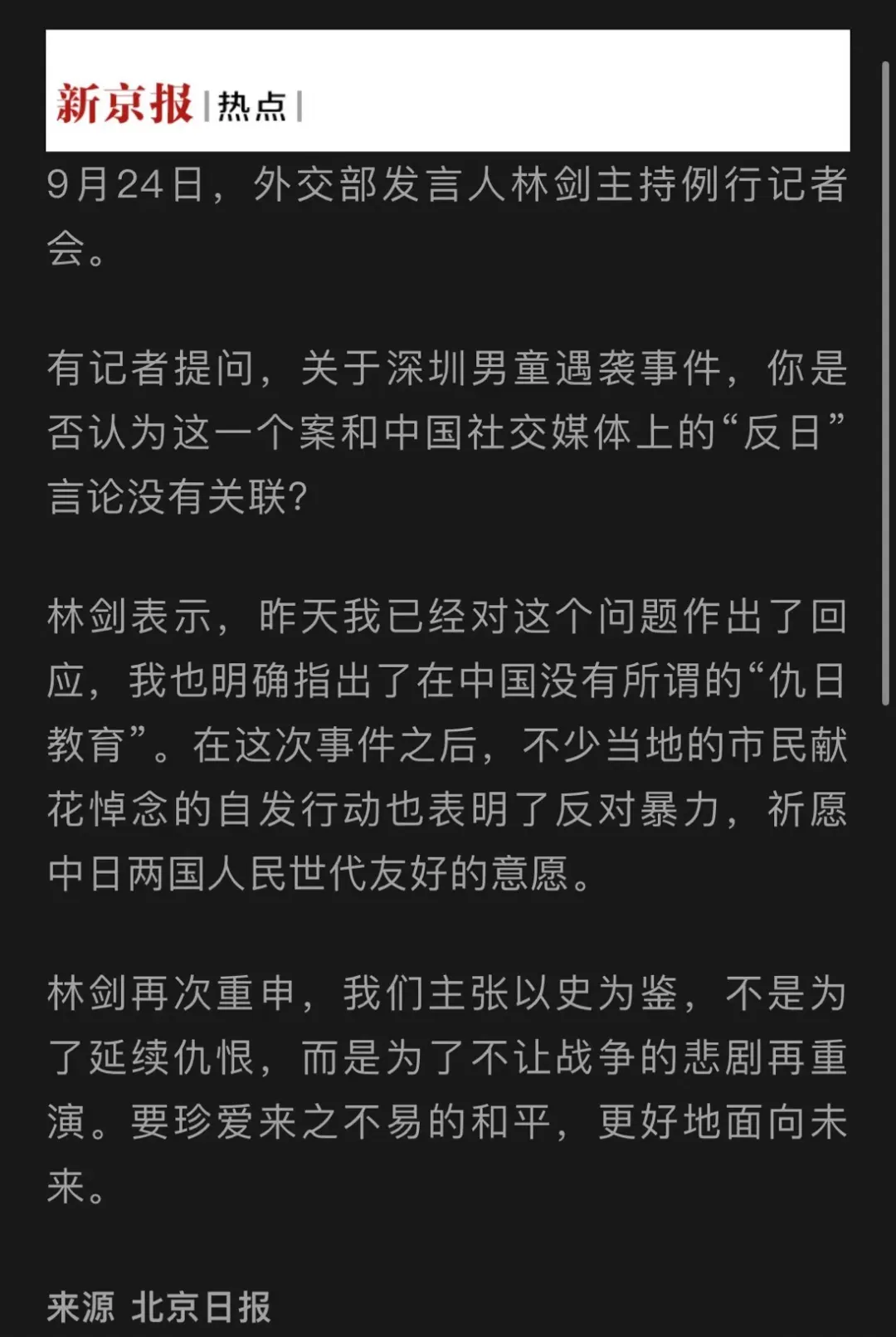 关于10岁小男孩遇袭的事,外交部也明确表态:中国没有“仇日教育”,我们主张以史为鉴,不是为了延续仇恨,而是为了不让战争的悲剧再重演。要珍惜来之不易的和平,更好地面向未来。