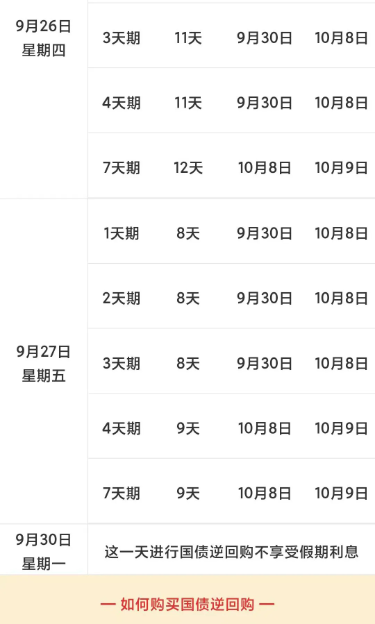 【银河证券】国庆佳节将至,人闲钱不闲,长假理财新姿势,现金管理+短债基金组合,具体操作为:9月26日可用资金买入2天期国债逆回购,可享11天收益;9月30日资金即可用,下午三点前买入短债基金,仍可享7天假期收益。一份本金,两份收益。银河严选债基详见以下链接:https://ubaa.chinastock.com.cn:8109/t/xaoRa 注:请注意基金的赎回费率设置。(当您购买基金产品时,既可能分享投资所产生的收益,也可能承担所带来的损失)(基金有风险,投资需谨慎)