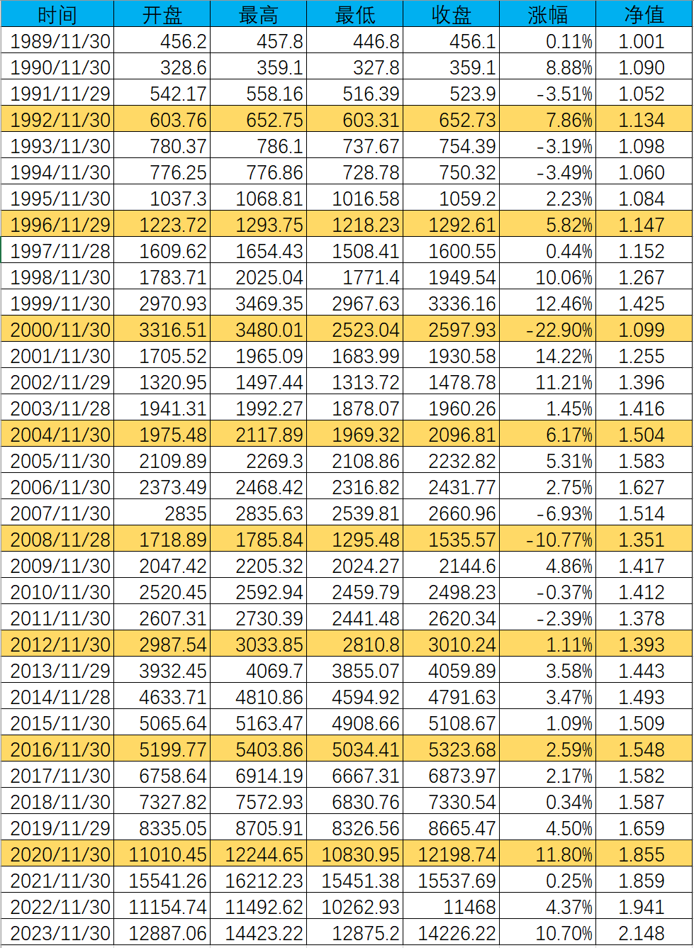 11月是美国大选时间,翻看历史上从1989年至今,11月纳指的走势: