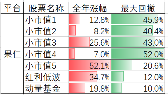 红利低波策略对标的红利低波ETF全年涨幅22.98%,最大回撤-15.16%;红利ETF全年涨幅19.68%,最大回撤-16.46%;动量基金策略暂时没有找到基准指数,但都跑赢了所有的宽基指数。
