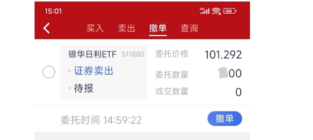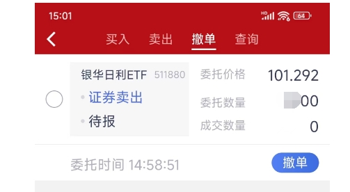 哎, 一样。 在银河挂了ETF到下午1点还是没法成交。撤了换华泰卖1委托,显示委托提交了, 却一直不成交。 撤销也没反馈, 钱回不来,白白损失8天利息。