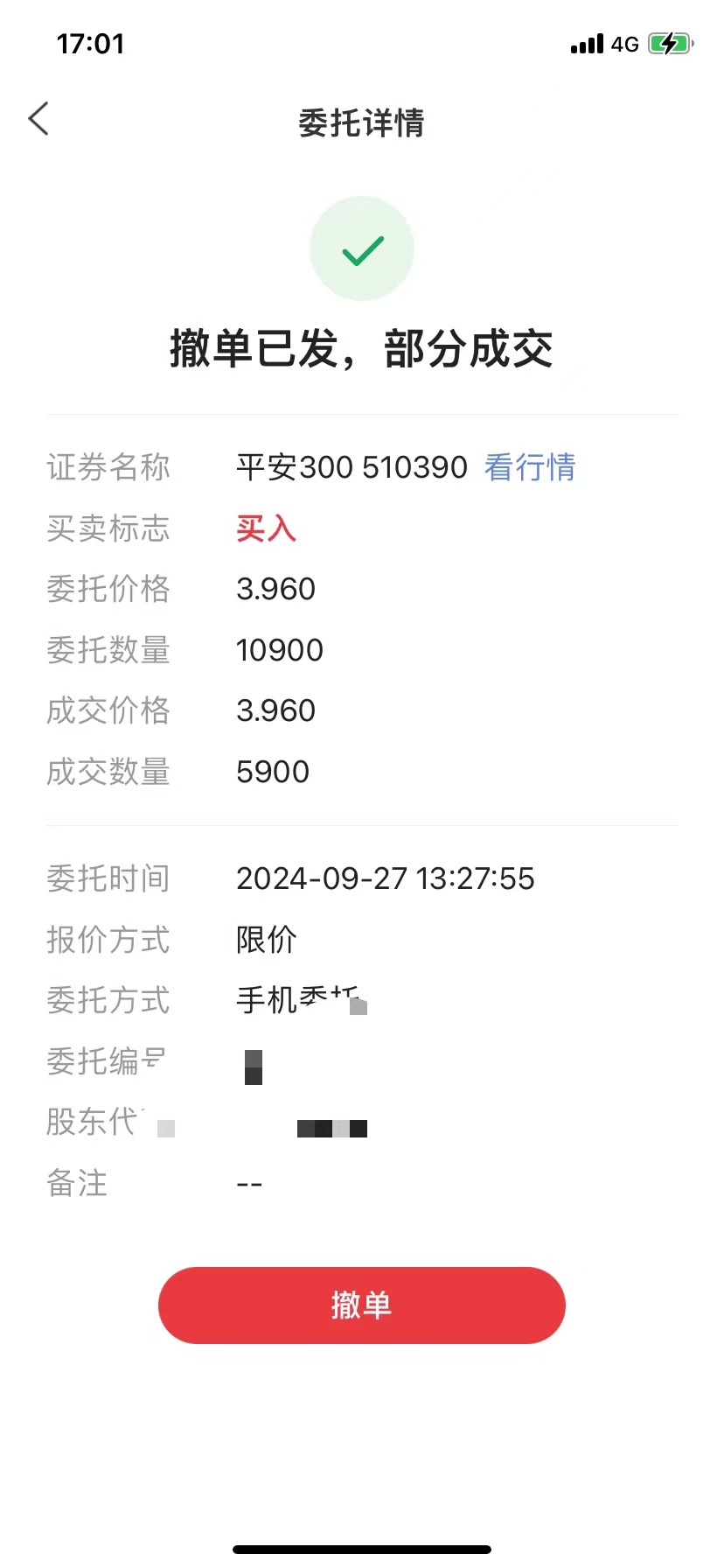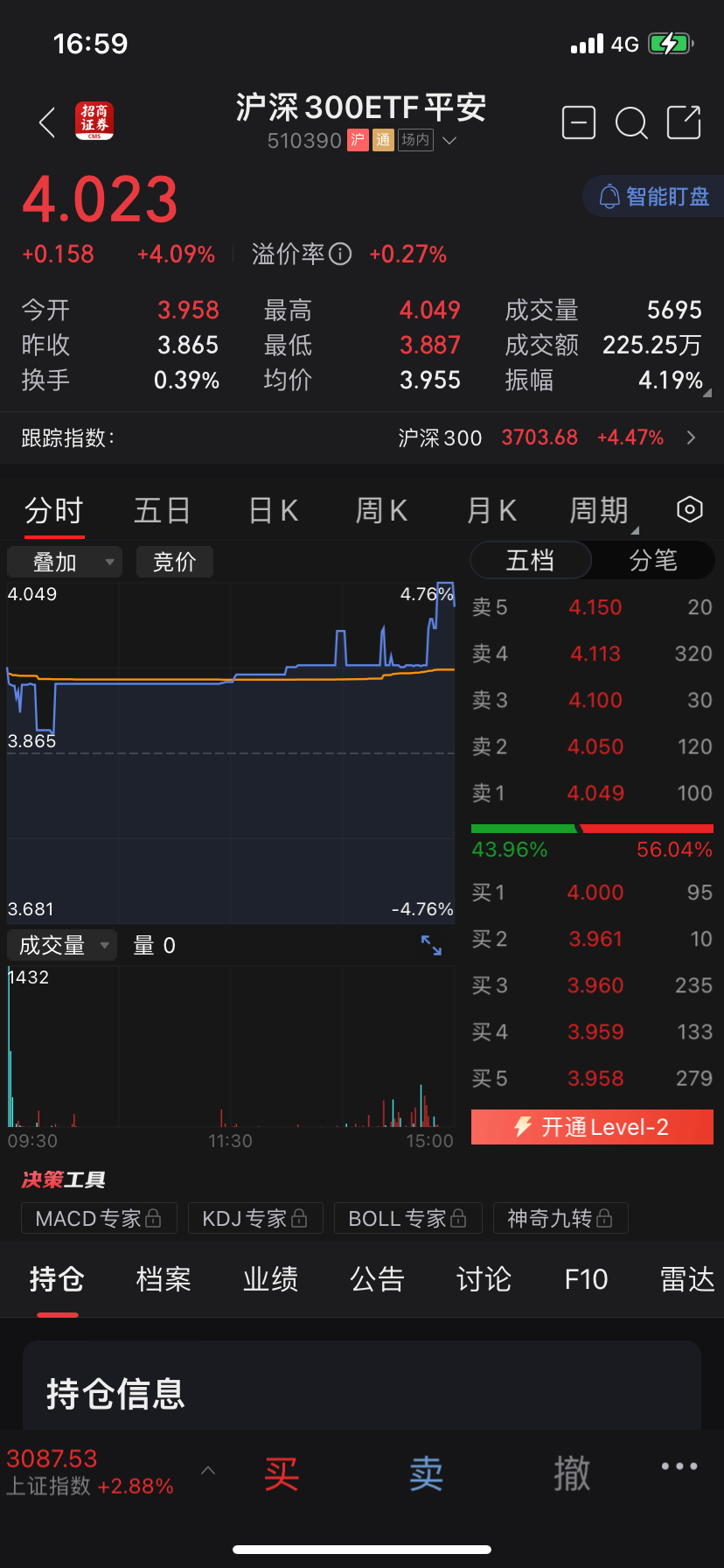 中午看着上交所拔网线了,看着沪深300指数都涨了4个点了,这只HS300平安到中午的时候涨幅还只是2.6%,于是果断把账户里剩的散碎银子都买了进去,可惜下午交易还是不正常,成交信息到收盘以后才反馈,也只成交了一半。
