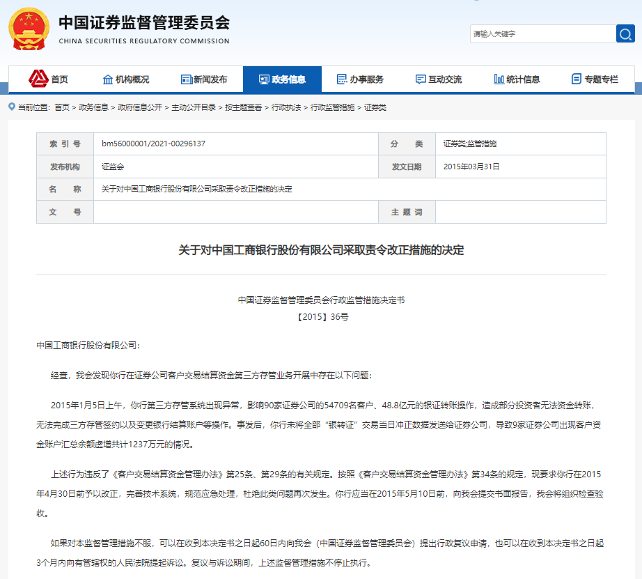 2015年1月5日上午,工行第三方存管系统出现异常,影响90家证券公司的54709名客户、48.8亿元的银证转账操作,造成部分投资者无法资金转账,无法完成三方存管签约以及变更银行结算账户等操作。事发后,工行未将全部“银转证”交易当日冲正数据发送给证券公司,导致9家证券公司出现客户资金账户汇总余额虚增共计1237万元的情况。