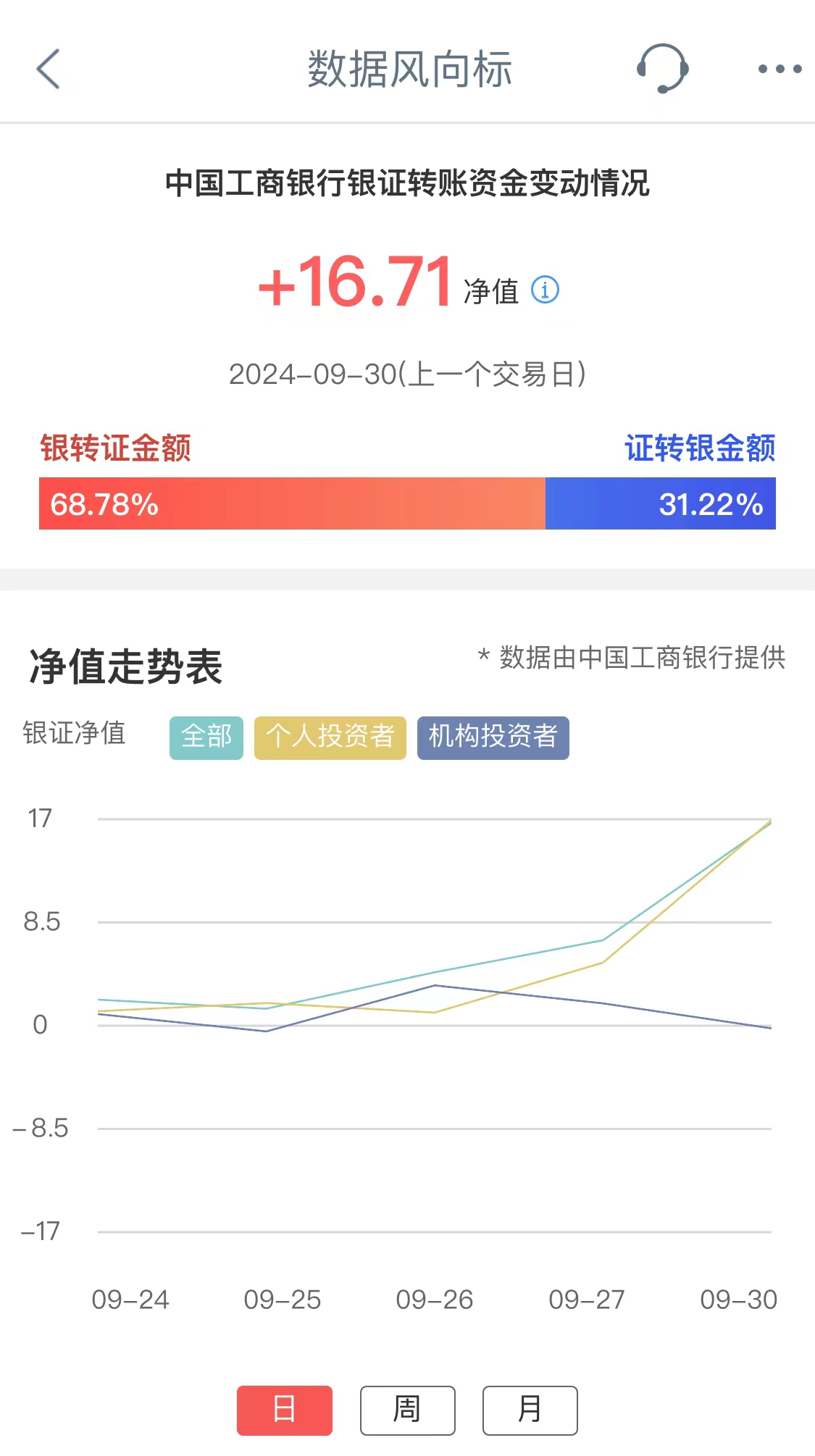 工商银行银证转账资金变动情况净值(简称银证净值)= (对应交易日银转证金额-对应交易日证转银金额) /2017年银证转账净转入证券市场资金量每日均值。