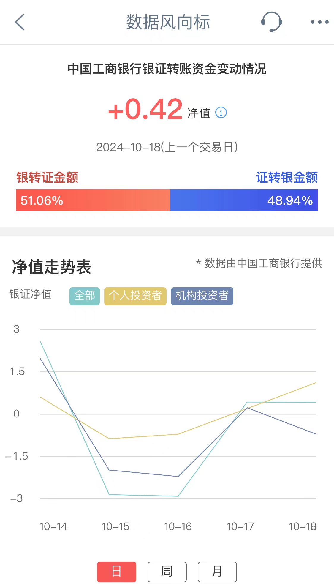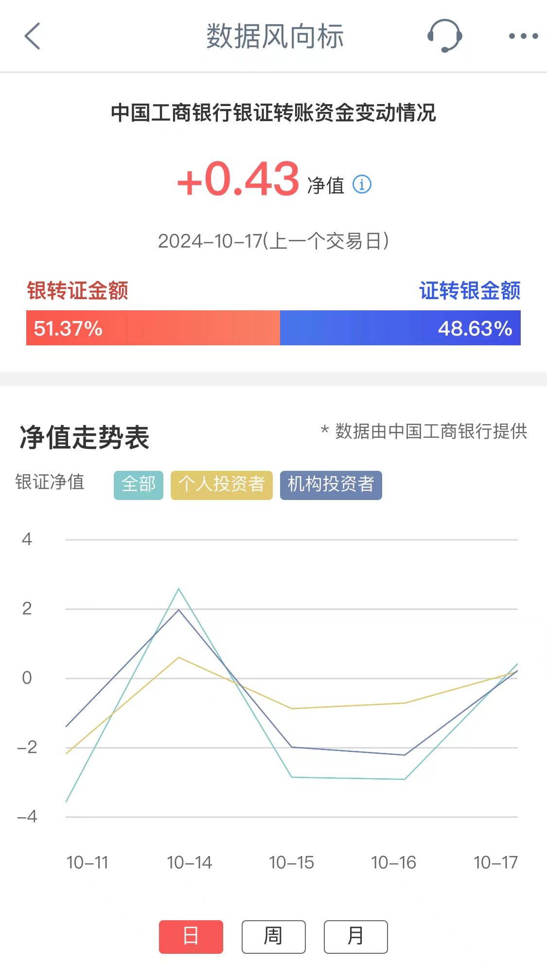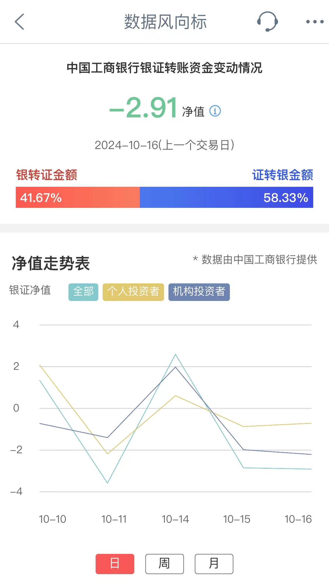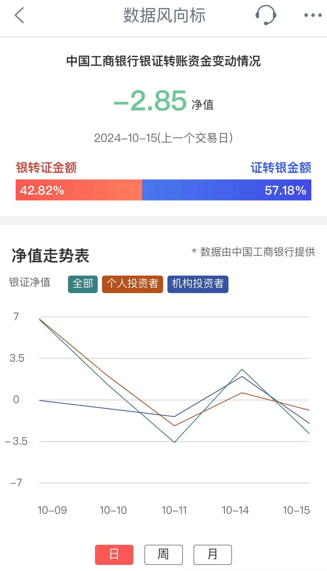 工商银行银证转账资金变动情况净值,其反映交易日工行全部投资者净转入证券市场资金量情况。净值为正,表示投资者资金净流入证券市场;净值为负,表示投资者资金净流出证券市场。
