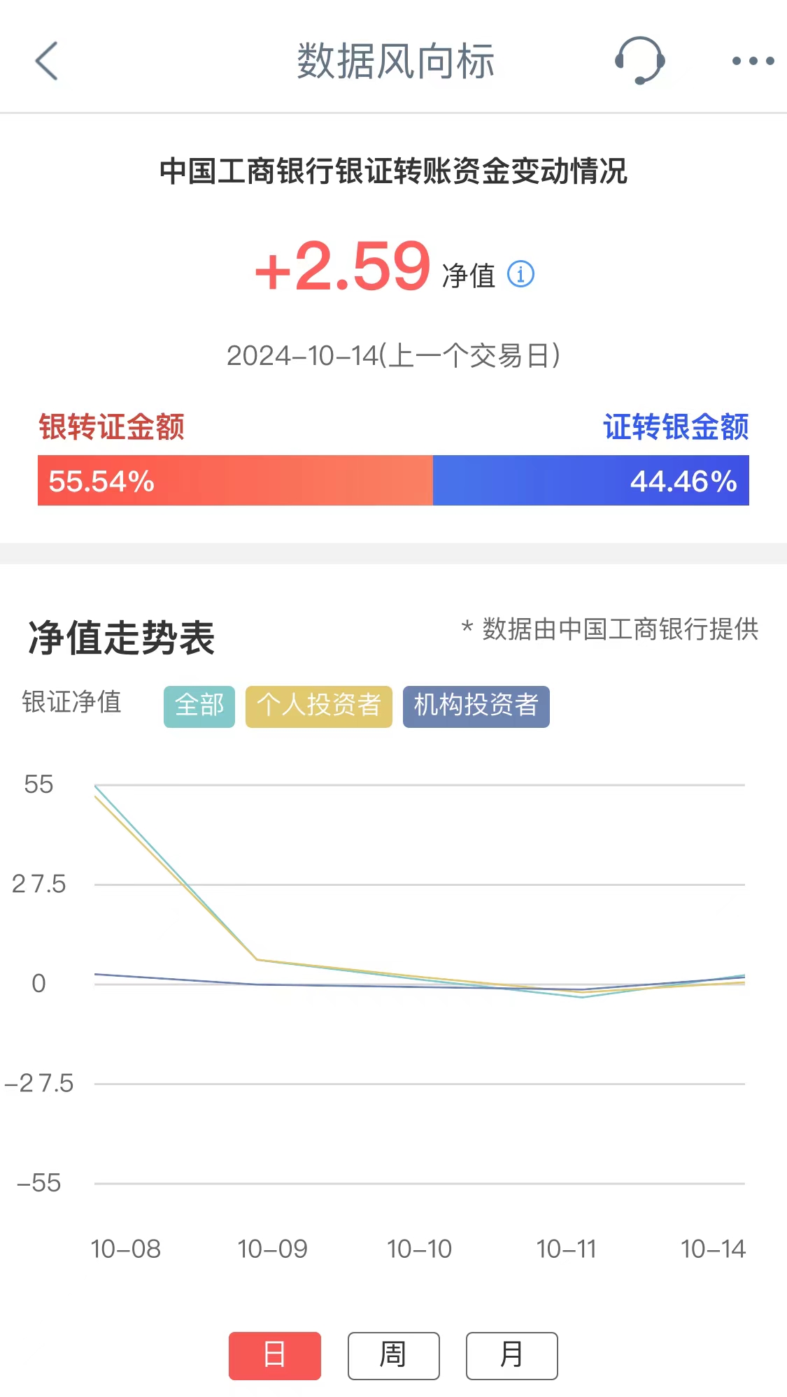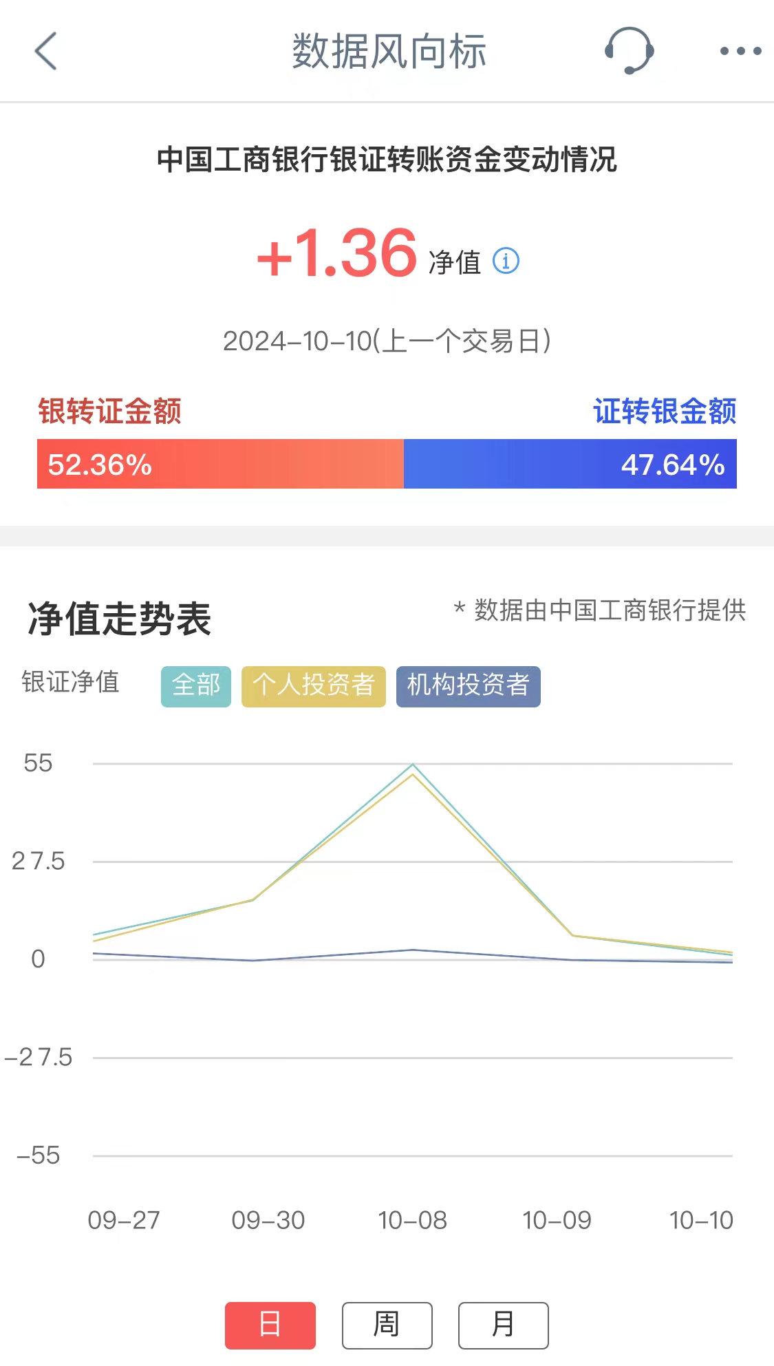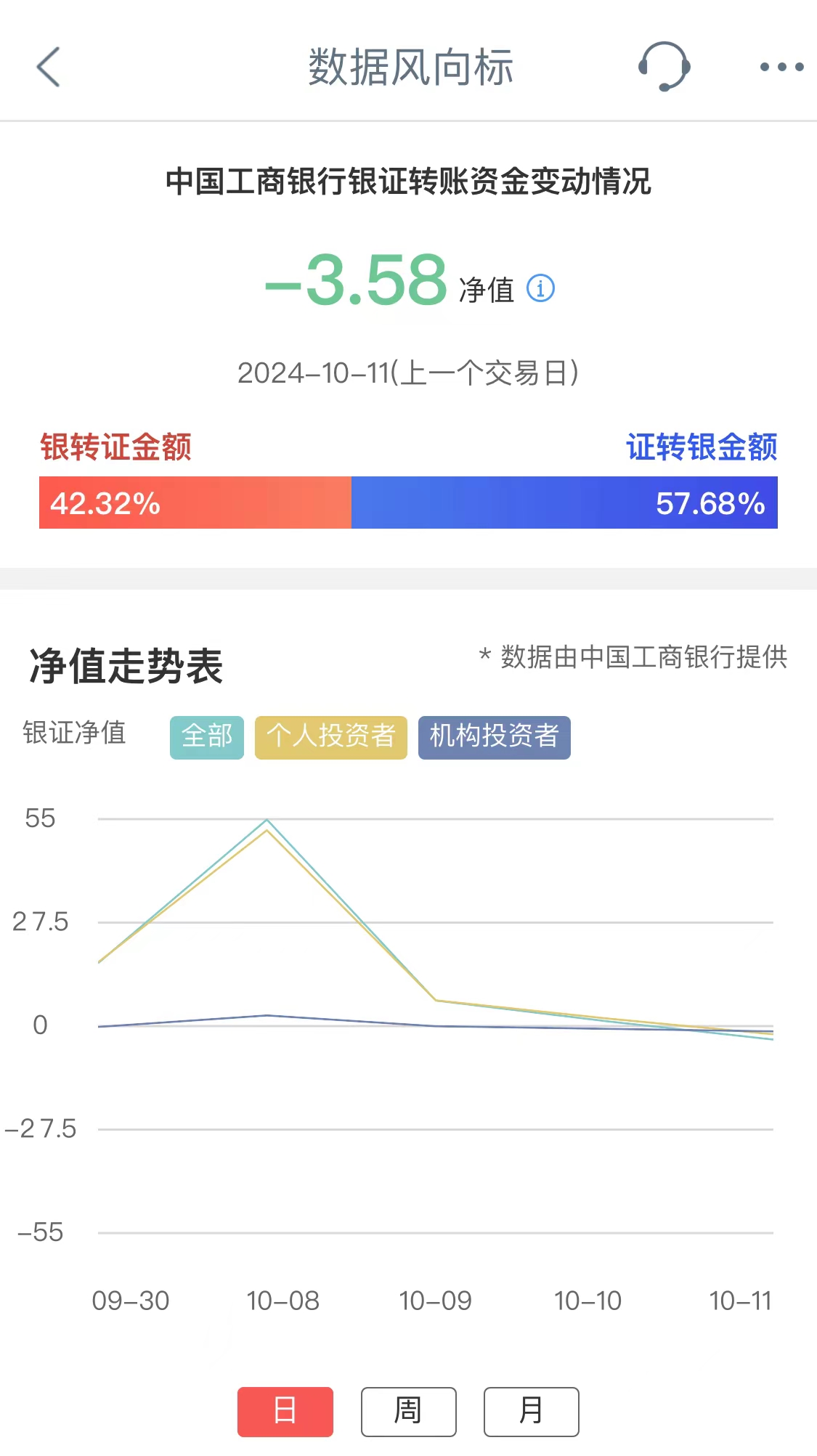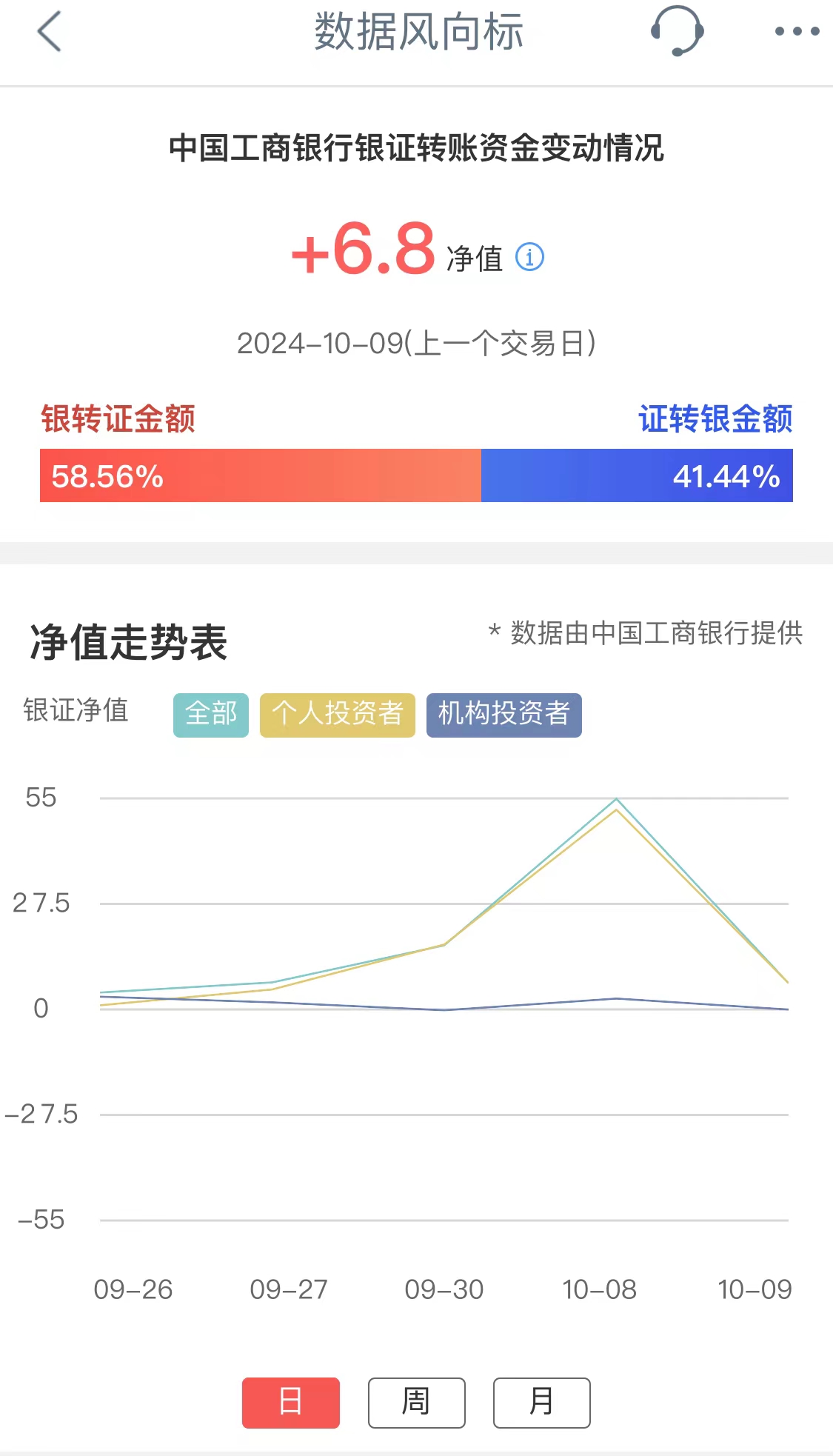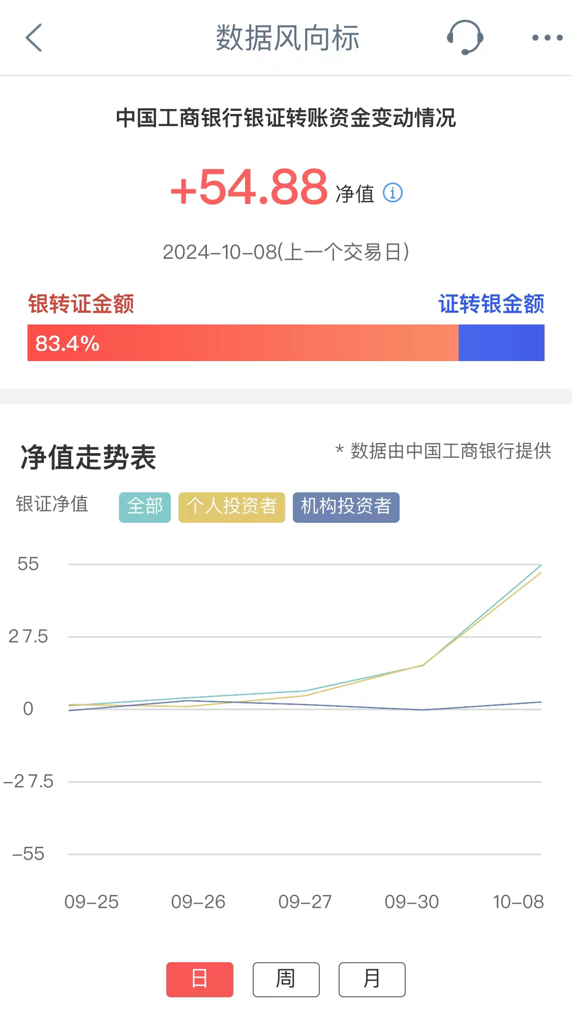 工商银行银证转账资金变动情况净值,其反映交易日工行全部投资者净转入证券市场资金量情况。净值为正,表示投资者资金净流入证券市场;净值为负,表示投资者资金净流出证券市场。