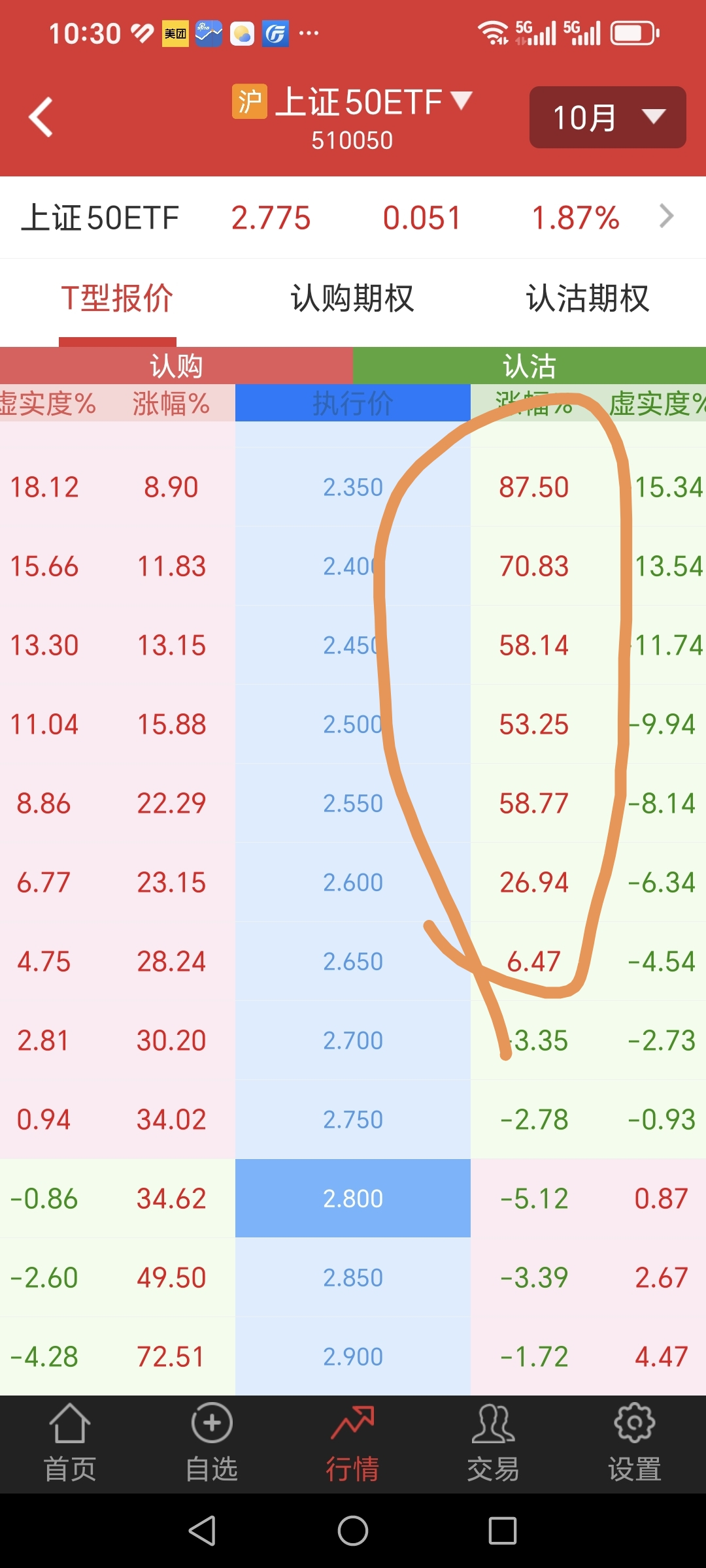 没明白你的意思,我发帖时间是上午10:45左右,当时上证50上涨4%,结果认沽期权比认购期权更贵,如果波动率上升,认购和认购都上涨我能理解,我不理解为什么认沽涨的更多我的天,这是t型报价,你圈着的部分涨幅应该和对角的比较,哪个是实值虚值搞清楚吗
