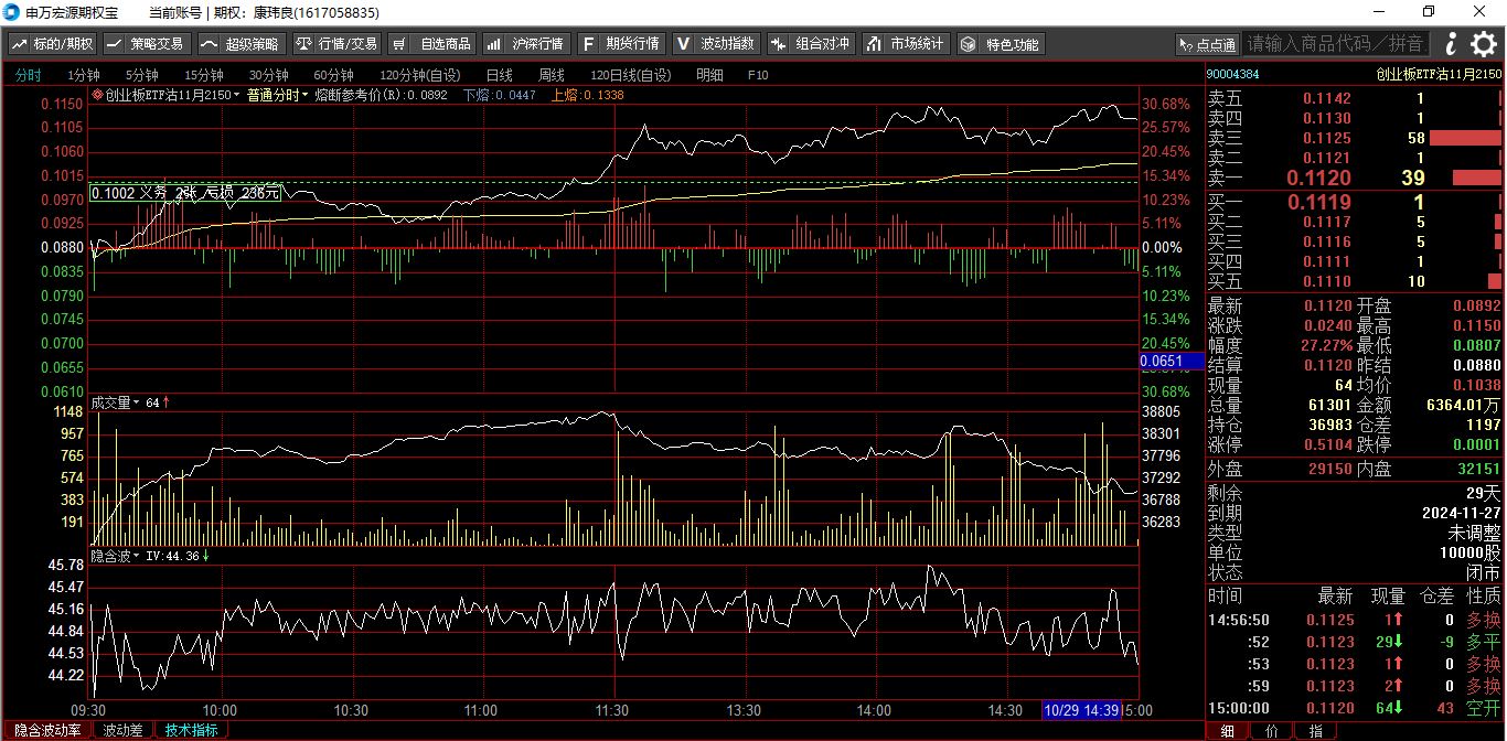 mark,我买的远月期权,创业板是明年3月份的,涨幅才一点点我觉得,现在适合远近搭配着来,胆子大点 ,远3近7,一般也要远近对半开,否则机会成本提高了。我开始也是远近对半,正好10.2日CHAU还没拉起来,我把远的换成部分近的。运气好,昨天CHAU爆发了。不过今天看看又能降低IV了。不知道有什么机会不