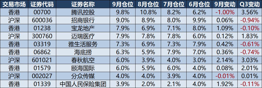 Q3主要增持:荣晟环保、腾讯控股、春秋航空、颐海国际、中国铁建H、迈瑞医疗、日经ETF、新华保险H。