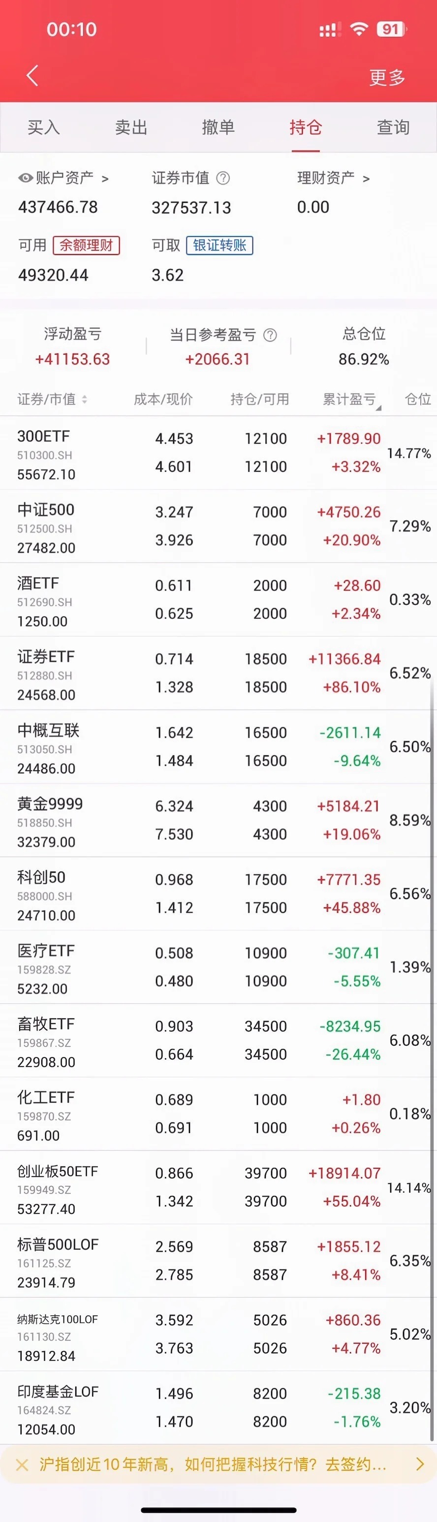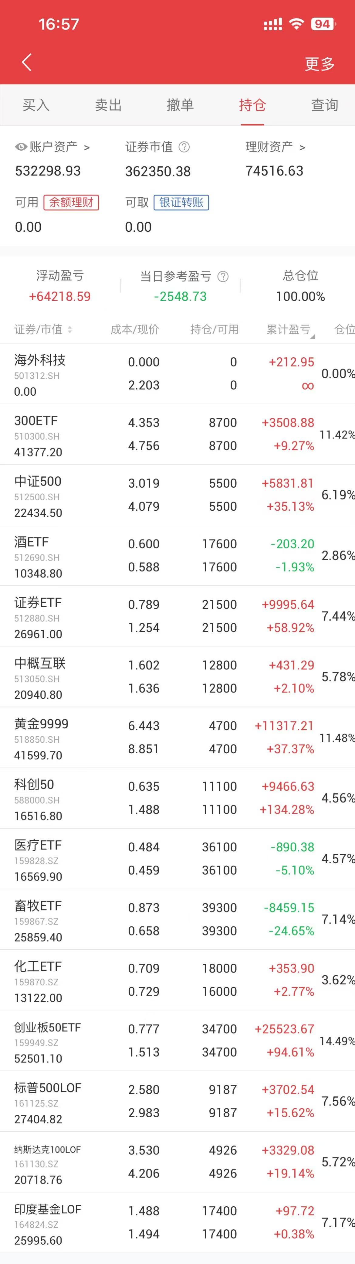 囿于熊市思维,以为只是一个反弹,这一周抛售了部分上证50ETF、证券ETF,现在后悔也没啥用了。转头向前看,虽然还没有回本,但黎明的曙光已经隐约可以看得到了~~~