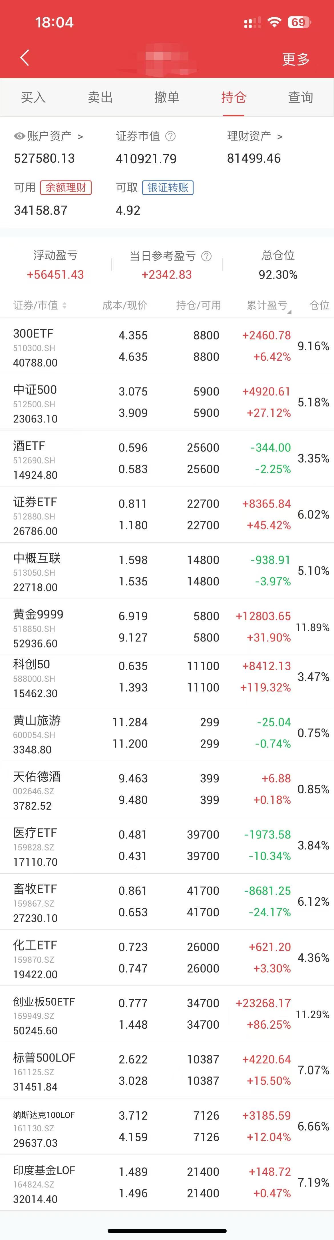到目前为止没有买过一手股票,基本以宽基指数和行业指数为主,刚开始主要买沪深300ETF、中证500ETF,之后受“茅指数”热潮影响,买入上证50ETF,慢慢又加入创业板50ETF、科创50ETF;再后来觉得一些行业低估、买入证券ETF、中概互联网ETF(513050)、畜牧ETF、医疗ETF。