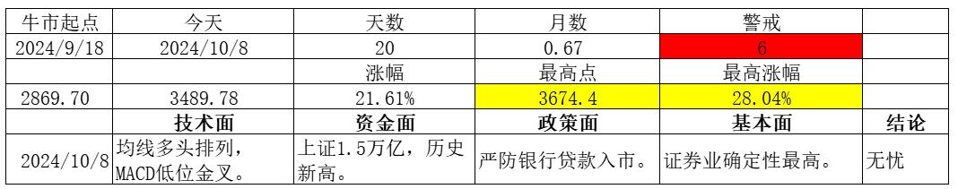 关注技术面,基本面,政策面,市场情绪的变化。每一轮牛市结束,都会伴随着估值泡沫化,叠加经济下行或增速放缓,上市公司利润增速难以支撑起高估值、高股价,或者有重大危机事件、政策打压等不利因素,使得市场做多信心受挫。简单而言,上证跌破60日均线警报拉响,跌破200日均线牛市结束。高度重视上证高位日线级MACD顶背离信号。