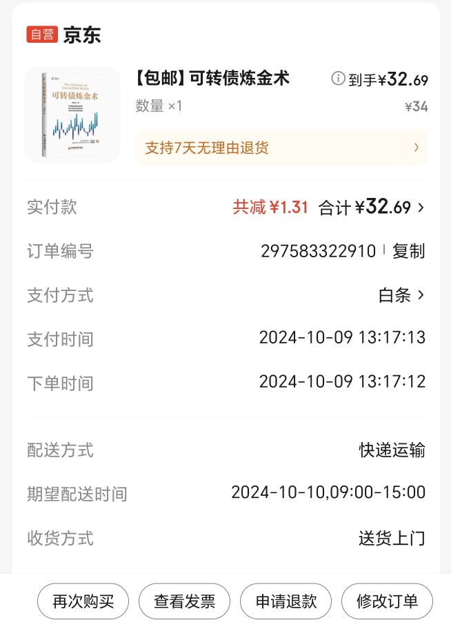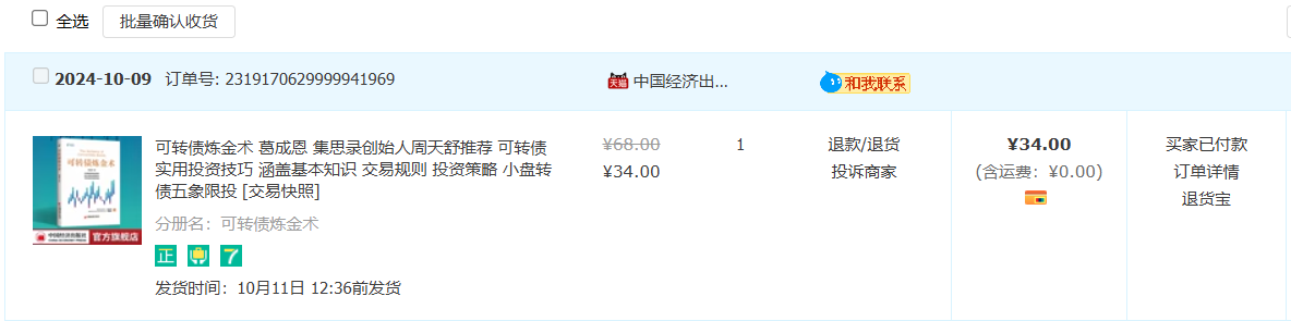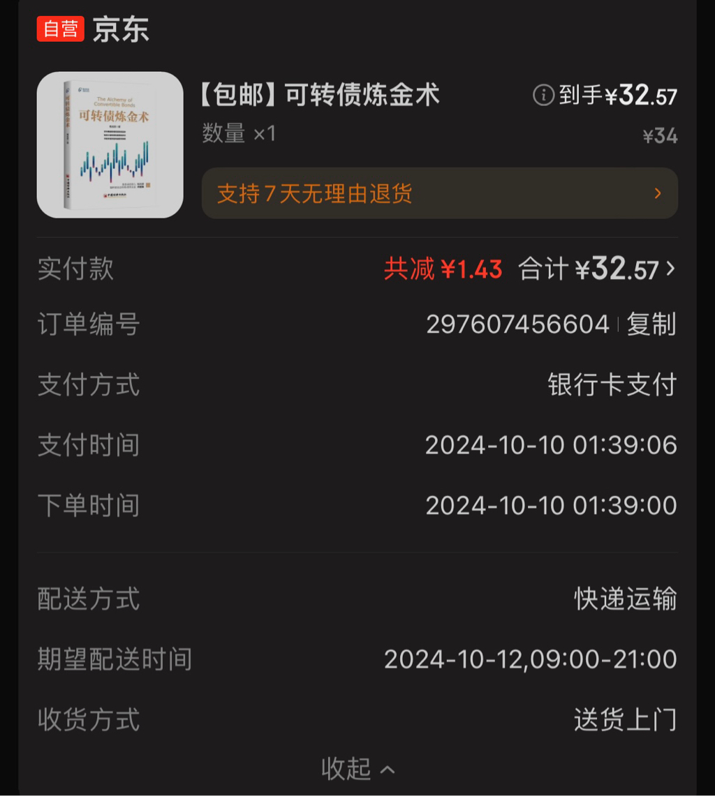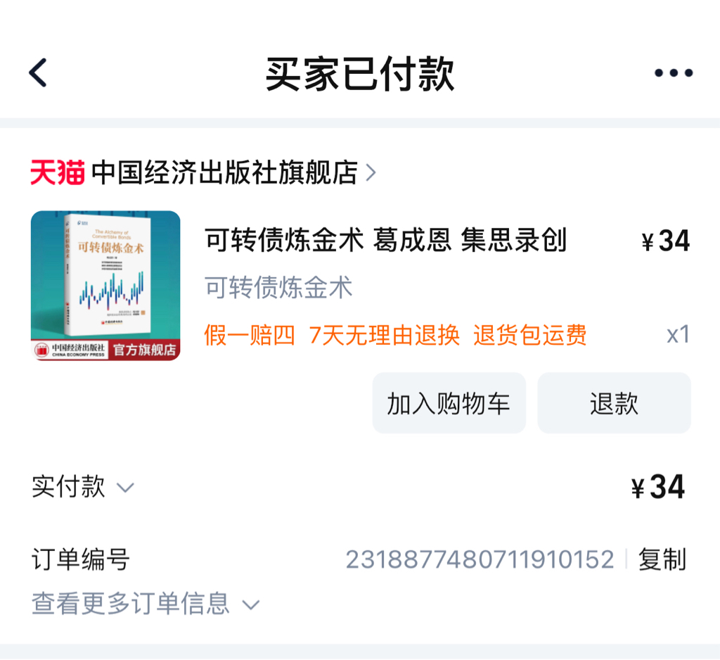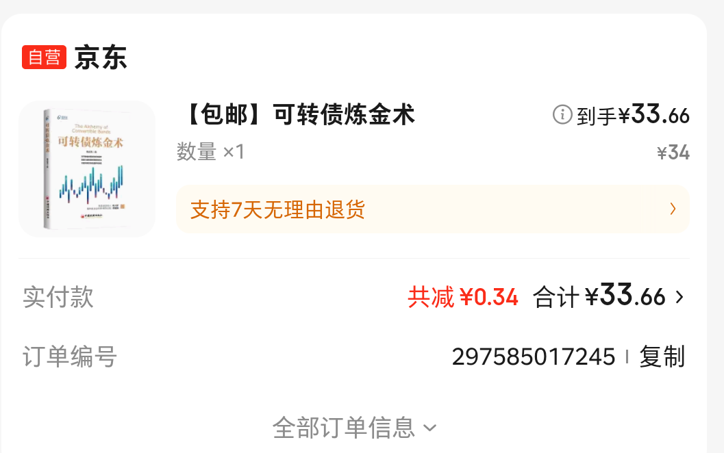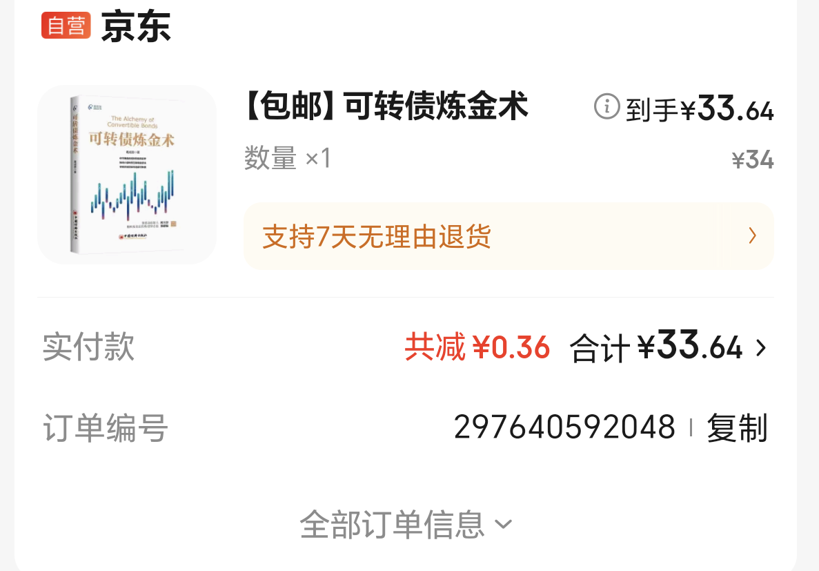 接龙 @打新交朋友 兄这个帖子(https://www.jisilu.cn/question/478696),我的著作《可转债炼金术》终于出版上市了,京东和天猫有售,下面是中国经济出版社提供的购买链接,五折包邮,每册仅需34元。