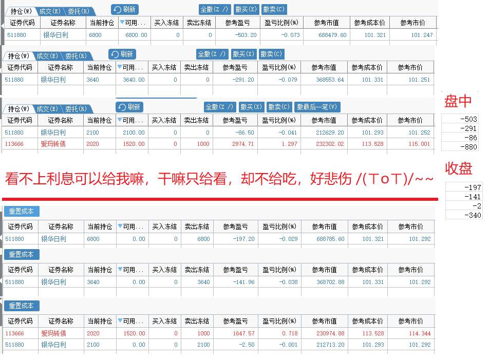 先说511880 ,今天好难过,既然不要利息,早点砸嘛,只给看不给吃算什么,好悲伤~~