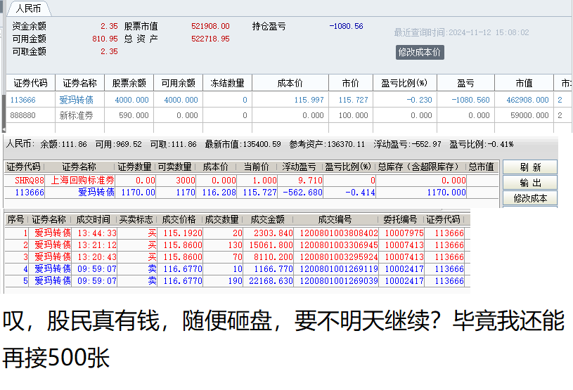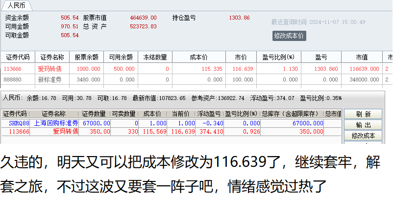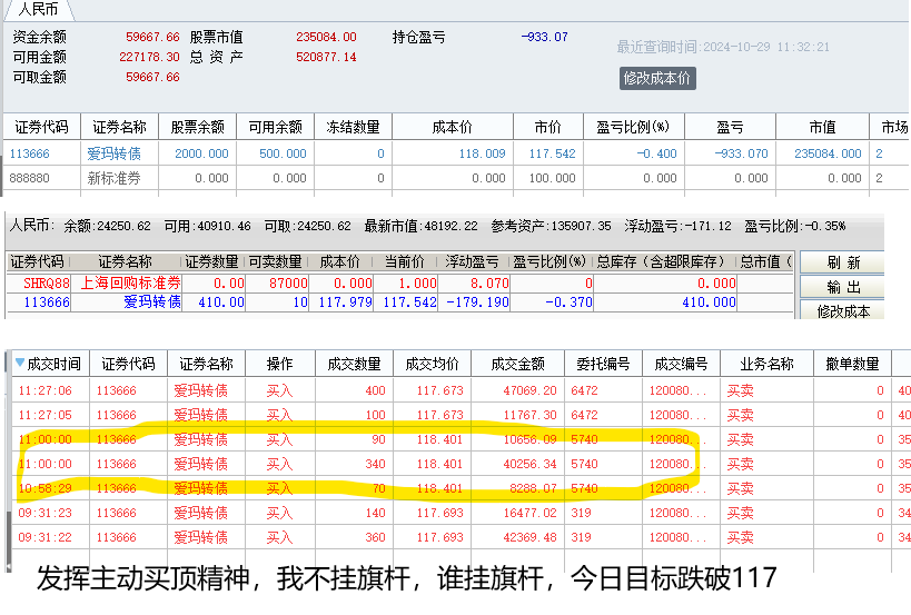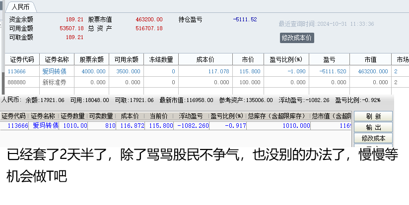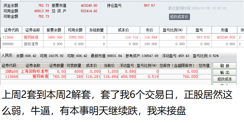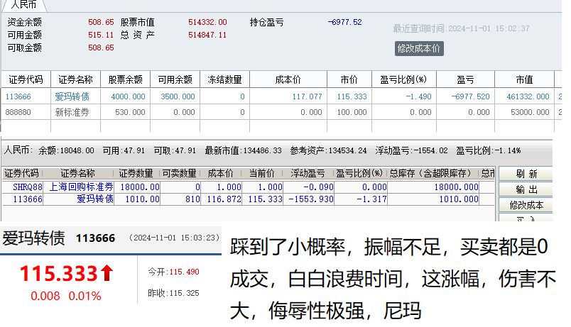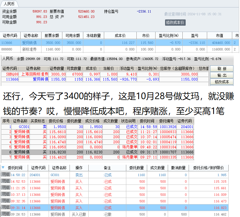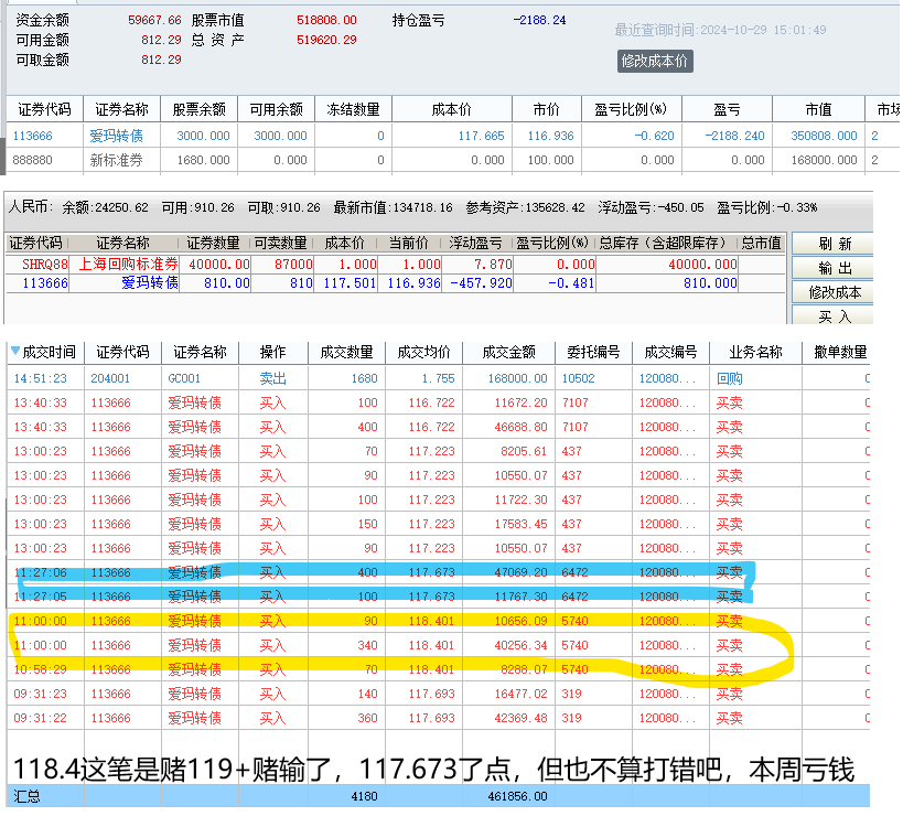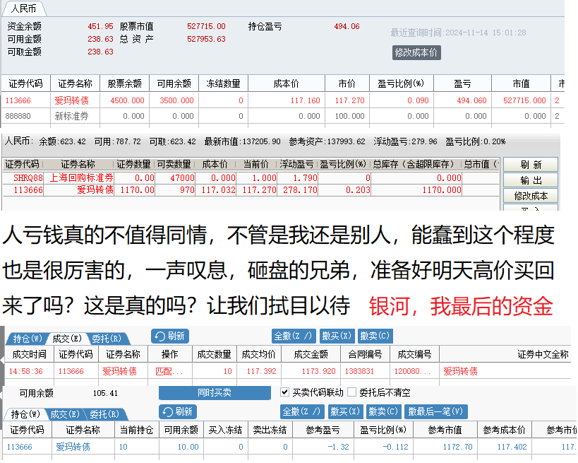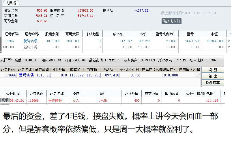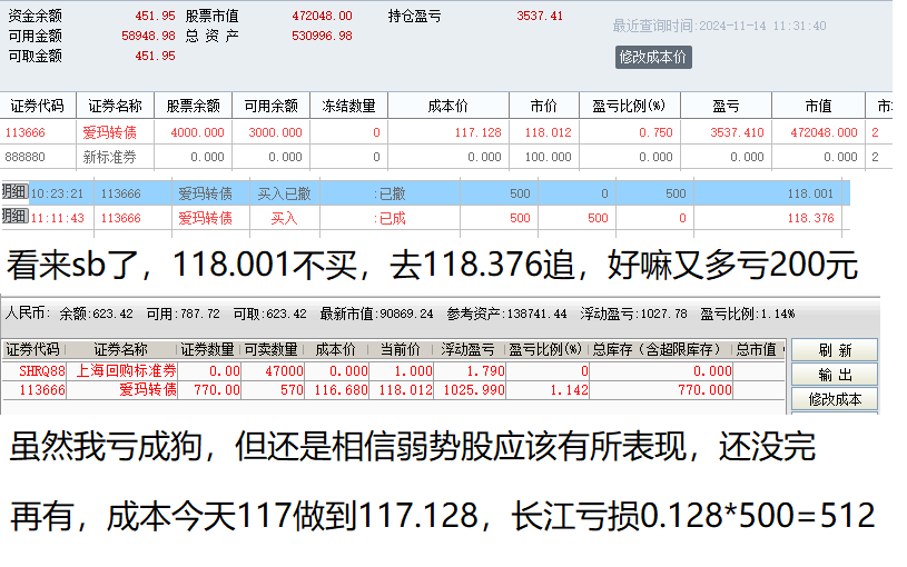 2024-10-21 追回撤,套死500张,另外700张差0.01%成交,这才是天不给我,银河成本改为114.878