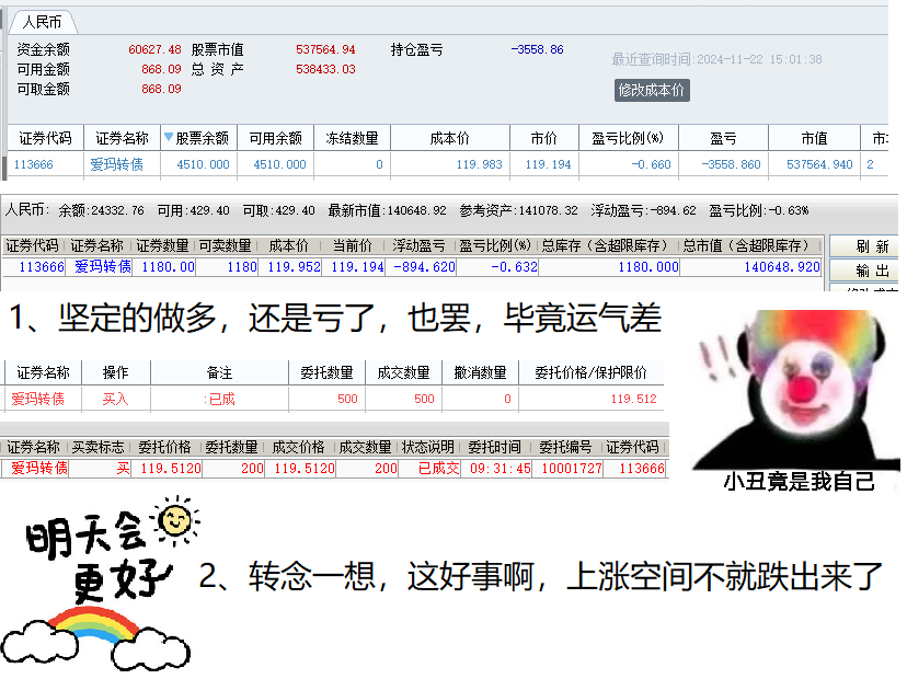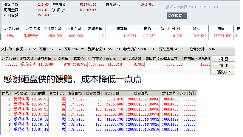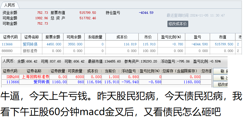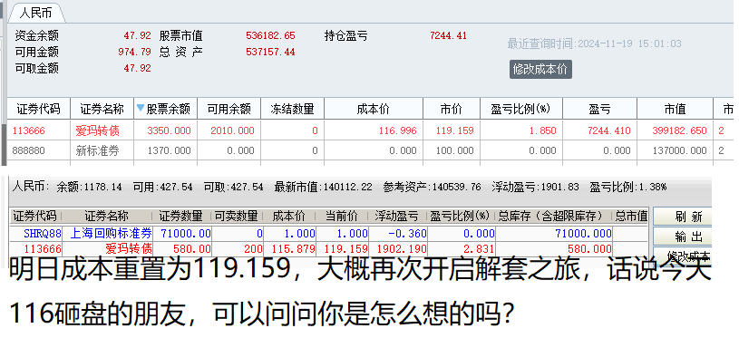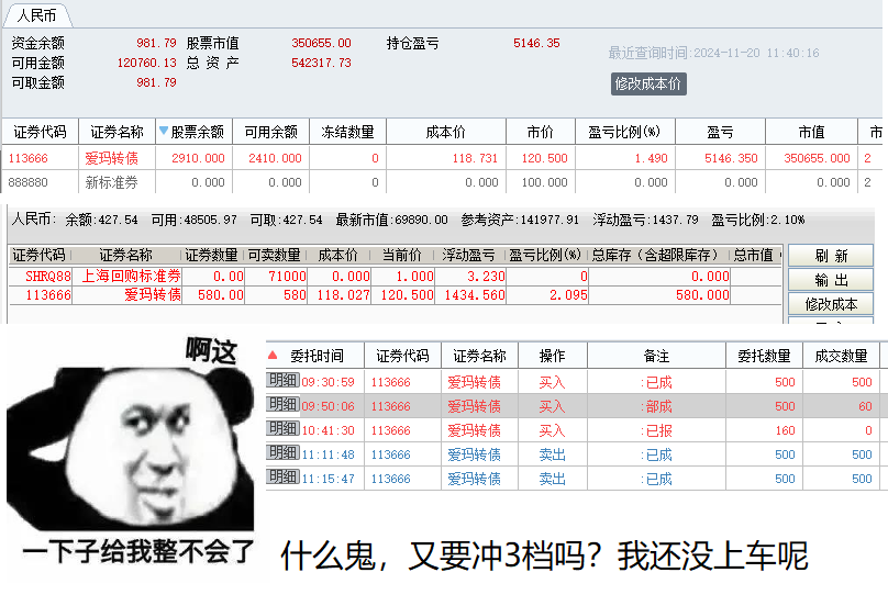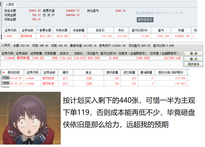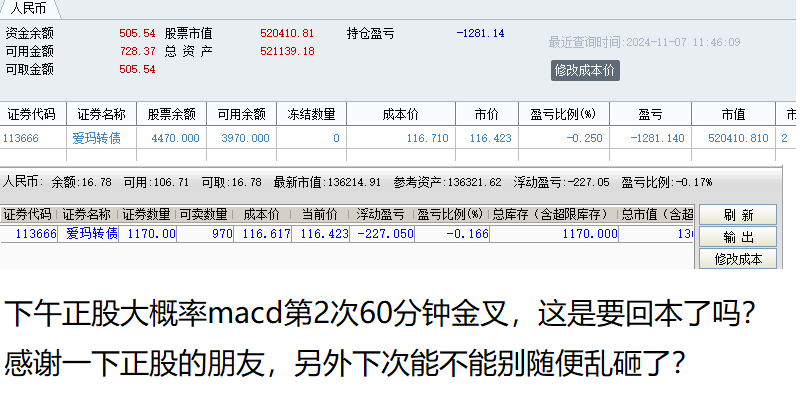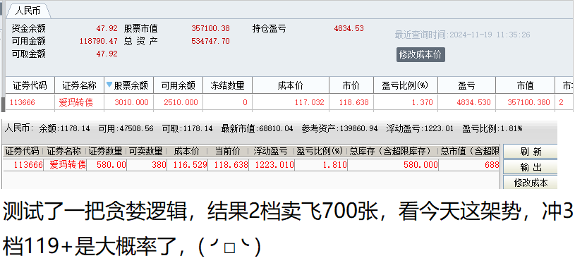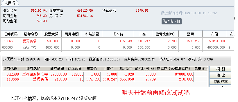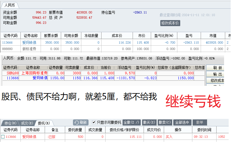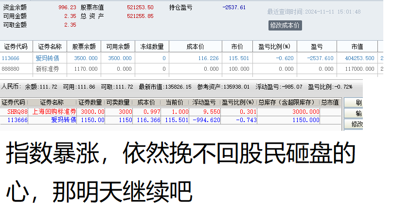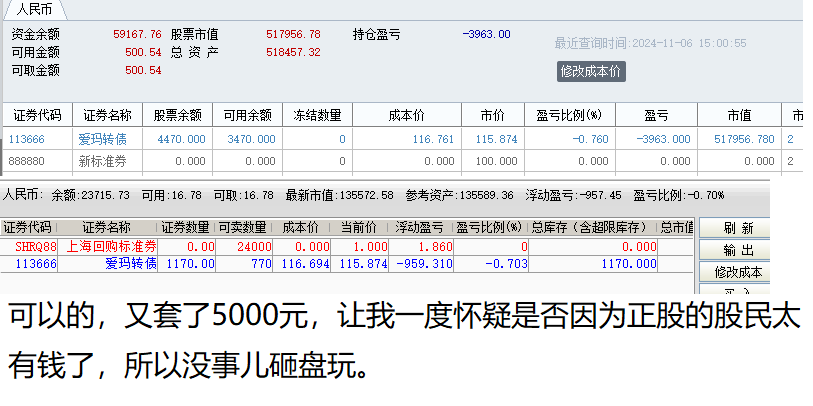 2024-10-21 追回撤,套死500张,另外700张差0.01%成交,这才是天不给我,银河成本改为114.878