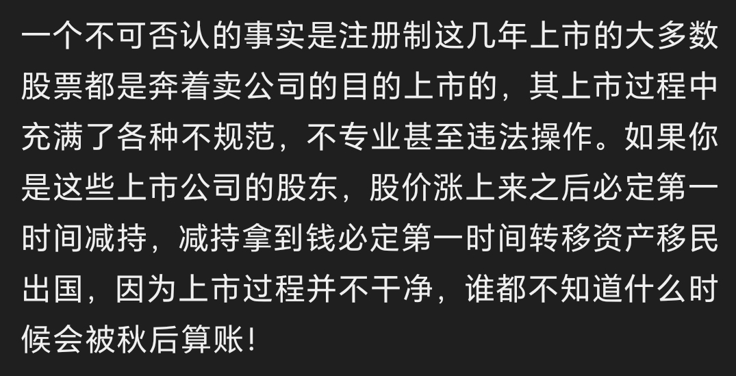 一个不可否认的事实是注册制这几年上市的大多数股票都是奔着卖公司的目的上市的,其上市过程中充满了各种不规范,不专业甚至违法操作。如果你是这些上市公司的股东,股价涨上来之后必定第一时间减持,减持拿到钱必定第一时间转移资产移民出国,因为上市过程并不干净,谁都不知道什么时候会被秋后算账!