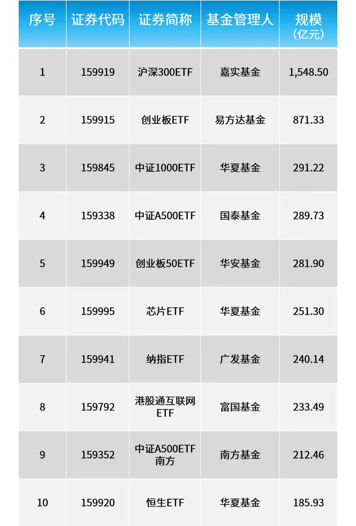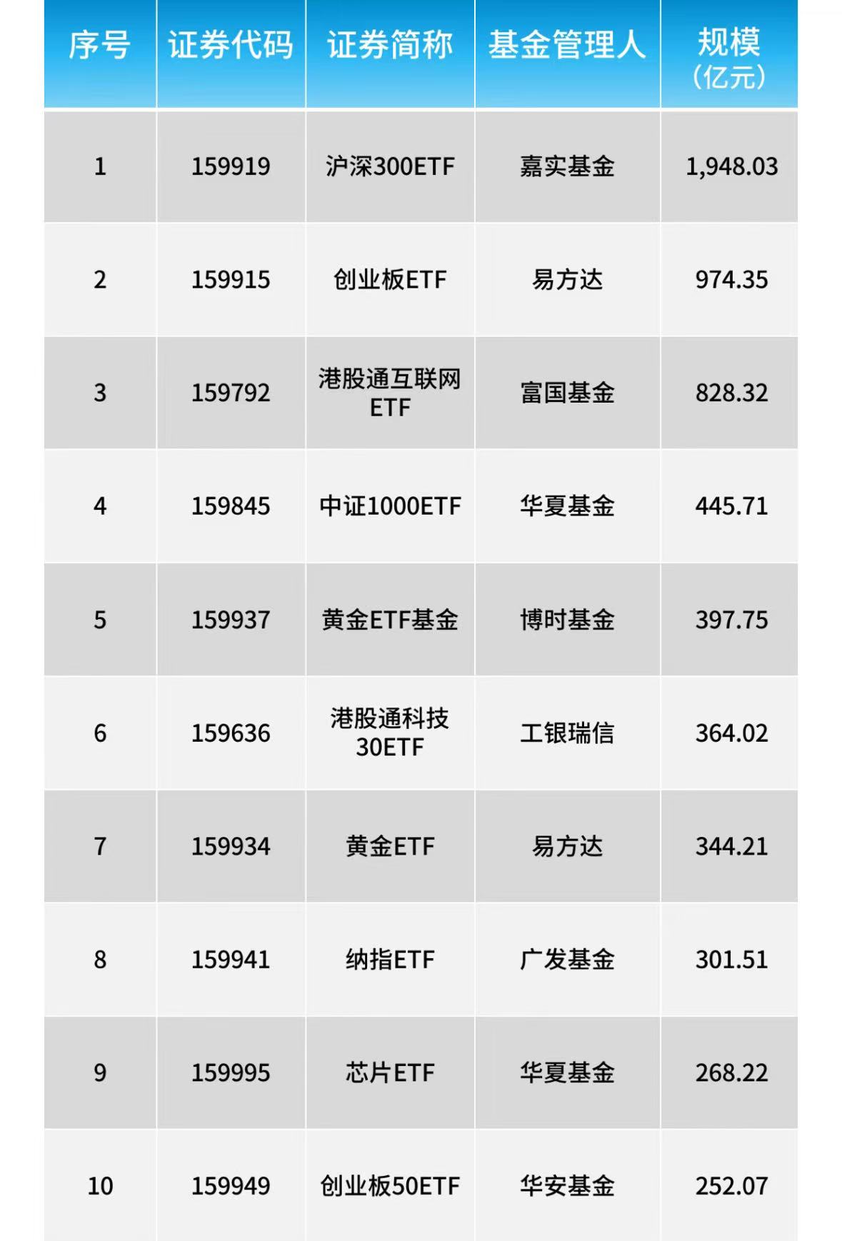 截至2024年10月末,规模最大的3只非货币ETF分别为沪深300ETF、创业板ETF和中证1000ETF,规模分别为1,565.42亿元、1,016.51亿元和324.26亿元。截至2024...