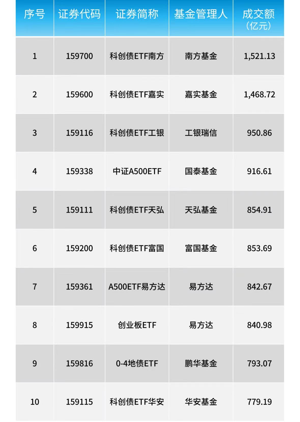 2025年10月成交额最大的3只非货币ETF分别为科创债ETF南方、科创债ETF嘉实和科创债ETF华安,成交额分别为 1,658.45亿元、1,283.01亿元和1,275.20亿元。