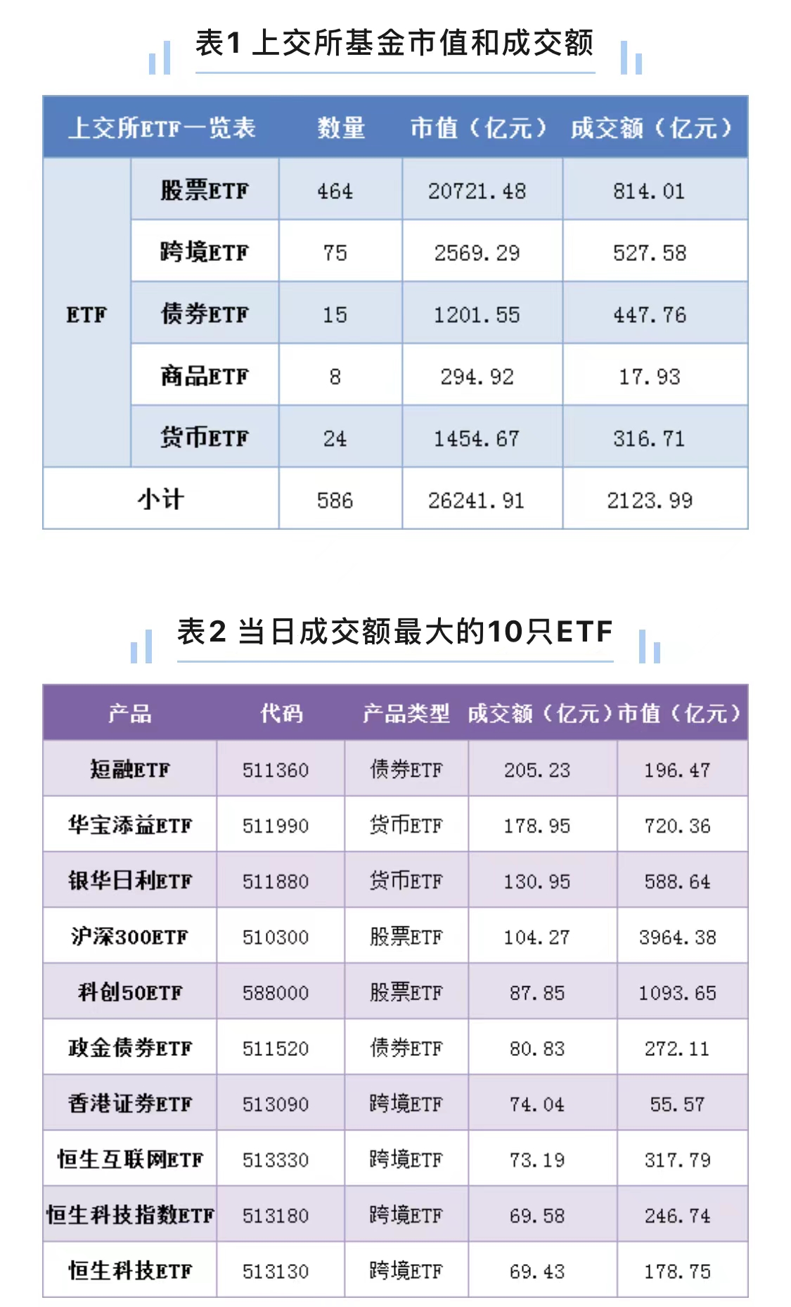 2024年10月15日,上交所ETF成交额合计2123.99亿元;截至上一个交易日,上交所ETF市场市值合计26241.91亿元。