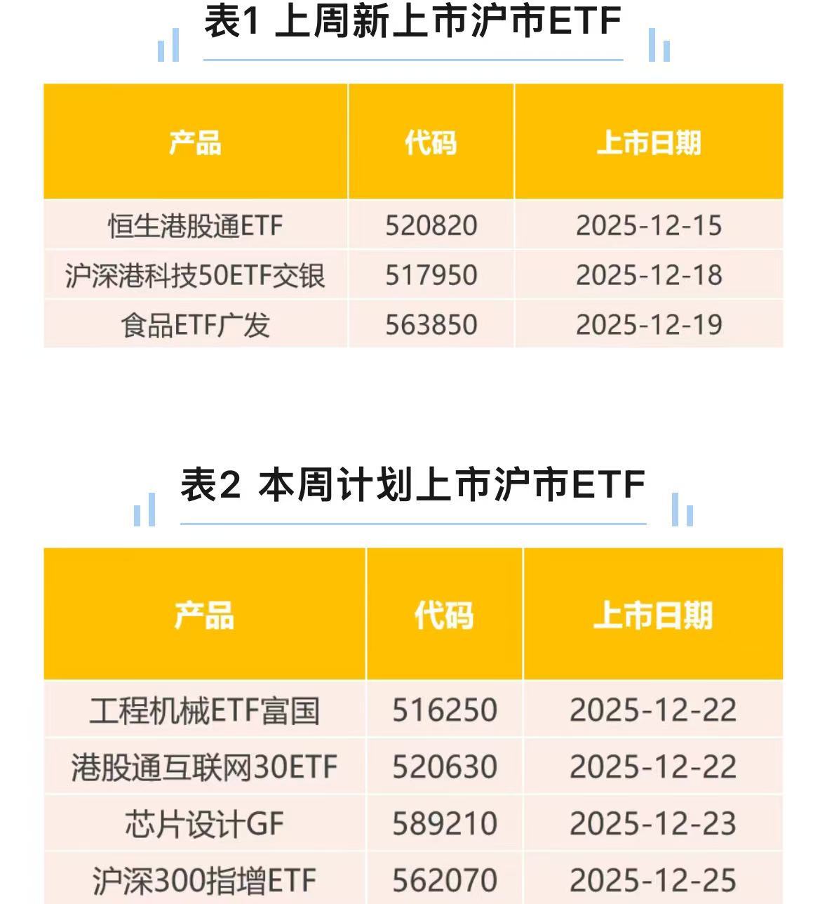 截至上一周末(2025年12月12日),上交所ETF市场共计挂牌788只ETF产品,上周新上市ETF产品1只,本周计划上市ETF产品1只。