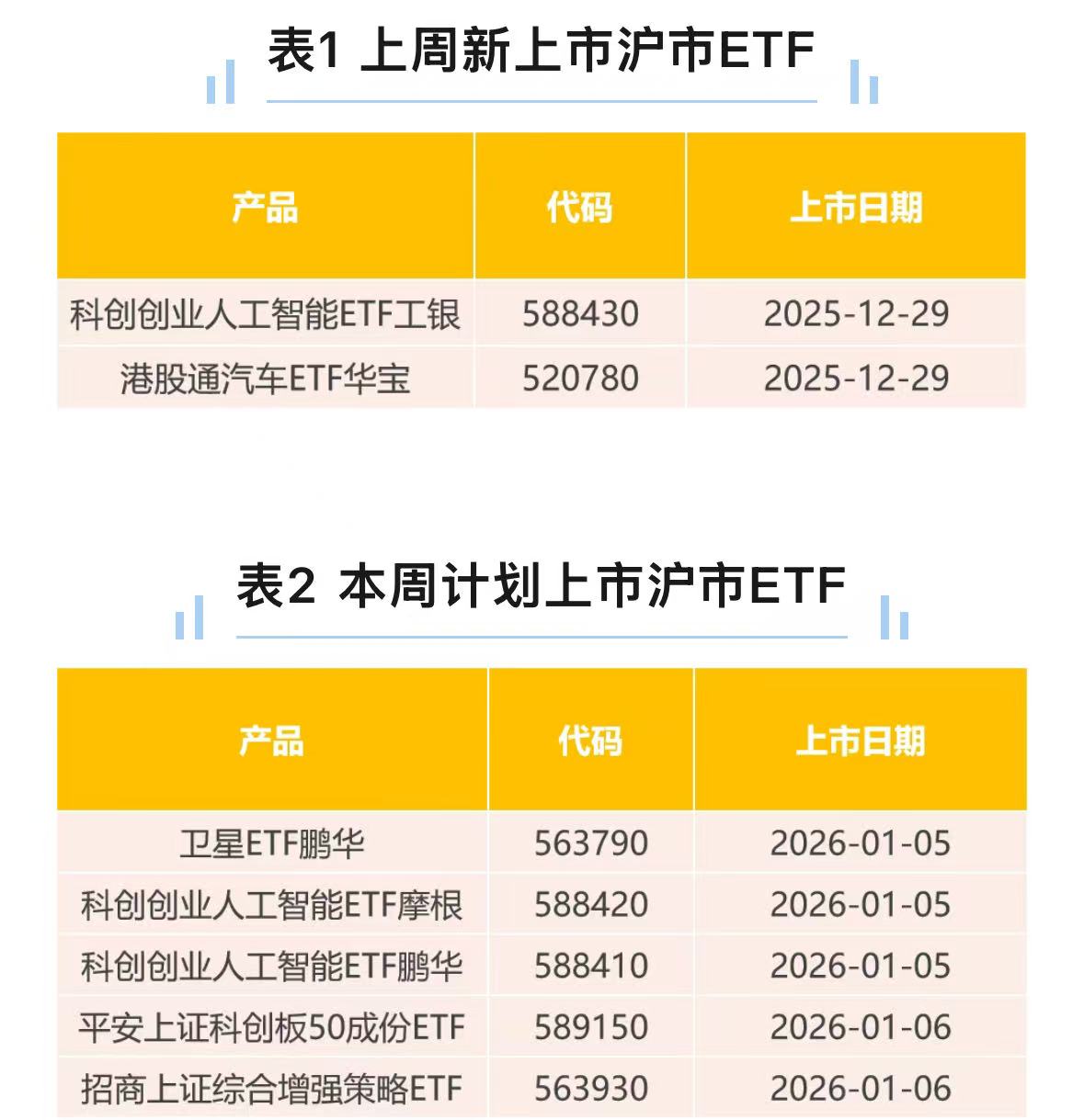 截至上周三(2025年12月31日),上交所ETF市场共计挂牌797只ETF产品,上周新上市ETF产品2只,本周计划上市ETF产品5只。