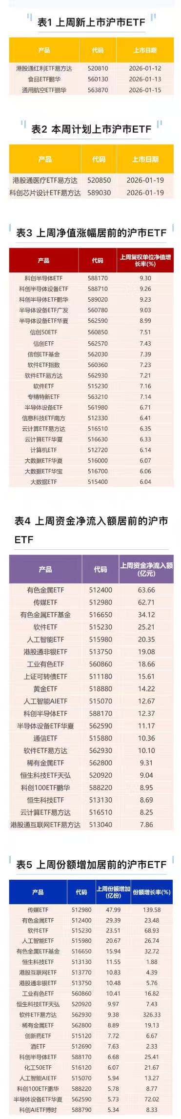 截至上一周末(2026年1月9日),上交所ETF市场共计挂牌805只ETF产品,上周新上市ETF产品8只,本周计划上市ETF产品3只。