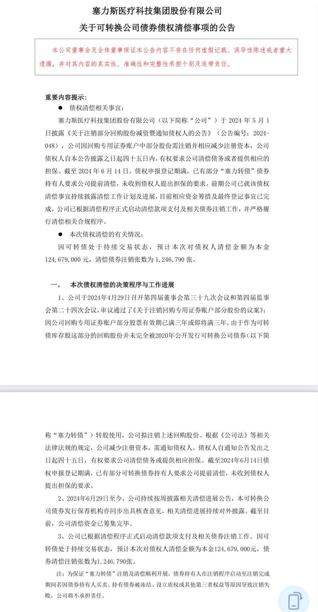 转债处于持续交易状态,预计本次对债权人清偿金额为本金124,679,000元,债