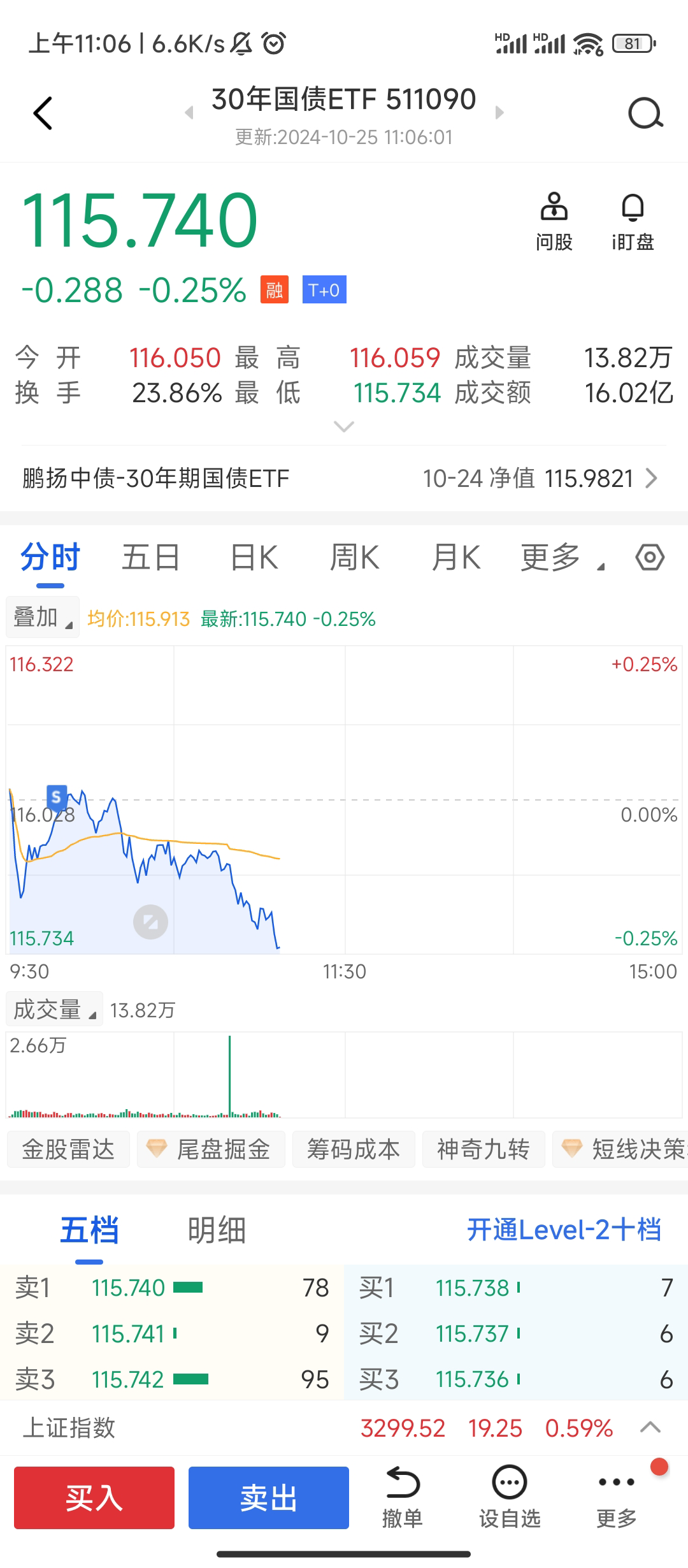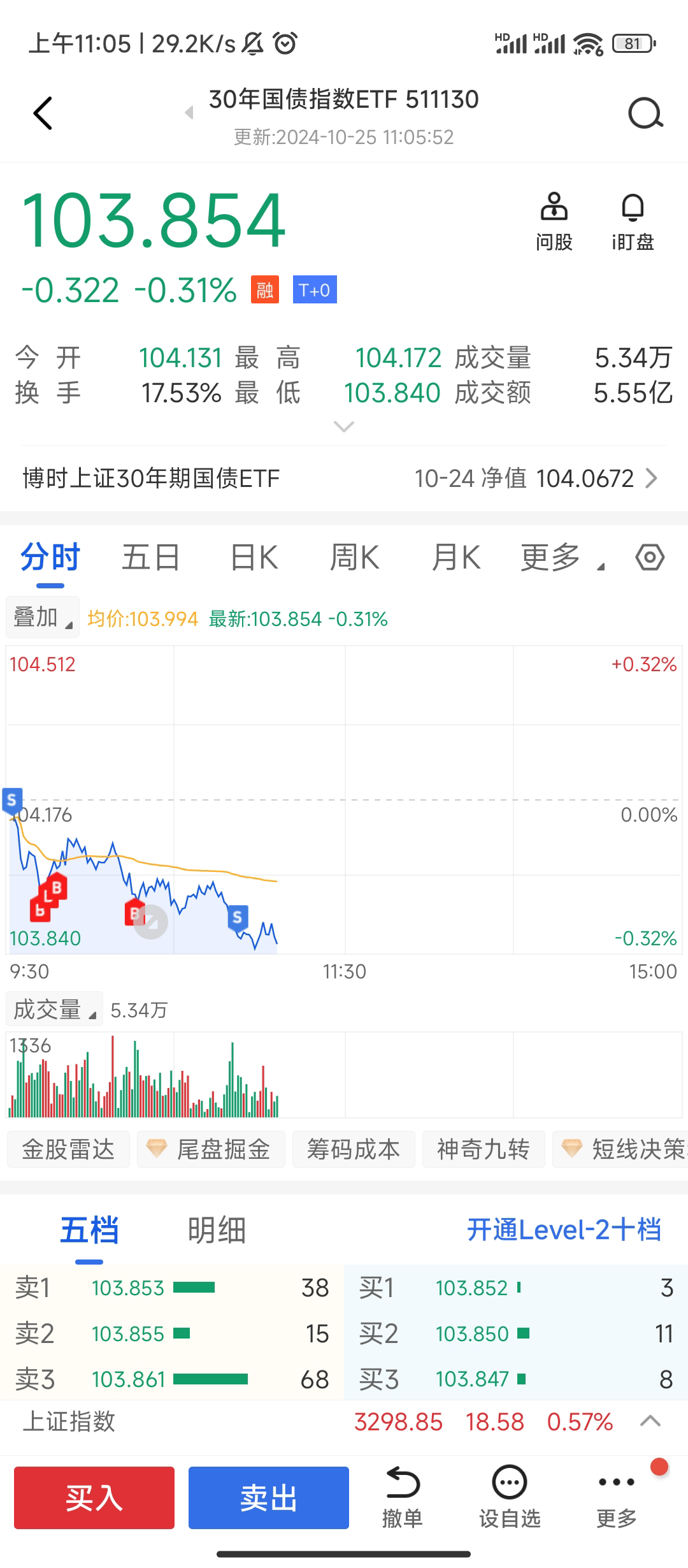 我买了30年国债,结果今天股市大涨,国债大跌,首盘我已经亏损超过0.5%,如果国债都看跌的话,我周一清仓割肉