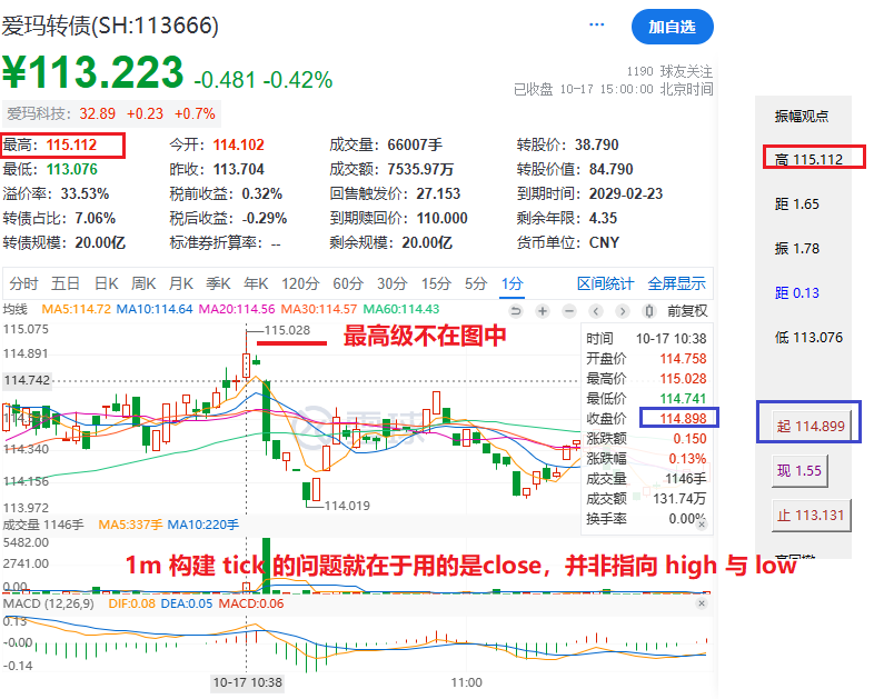 当然,也只能是逼近,因为只有close 是最高点,那么其high 才是有机会是最高,但实际情况是,出现最高点的1m K线 其close 不见得也是最高,低点也同理,还是用艾玛举例,就昨天的情况,逼近后的结果如下: 高点正确,低点有差距,原因如图,最低点出现时,close已经收上去了