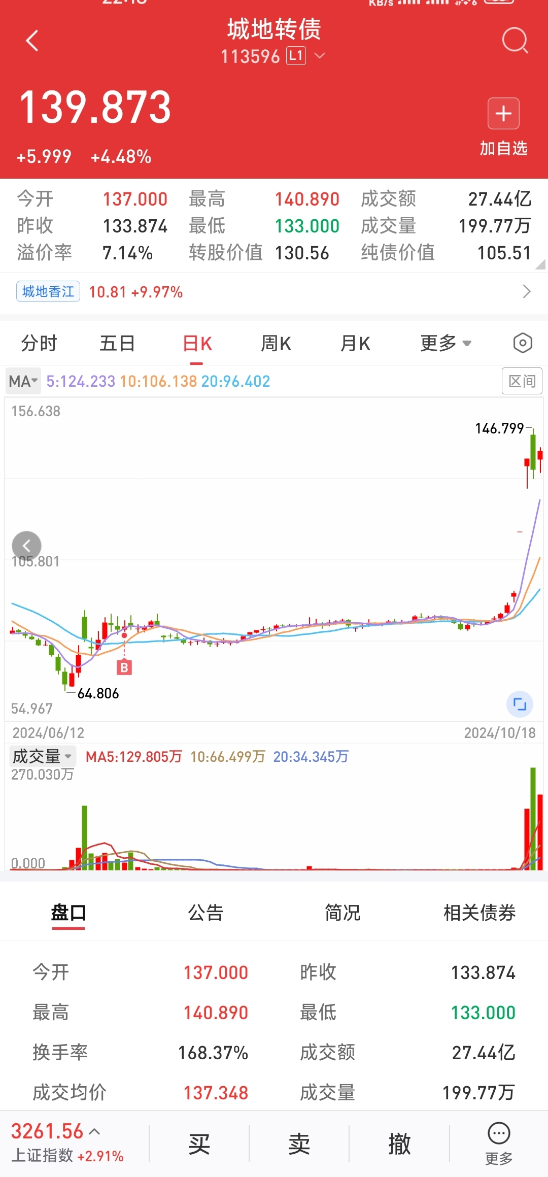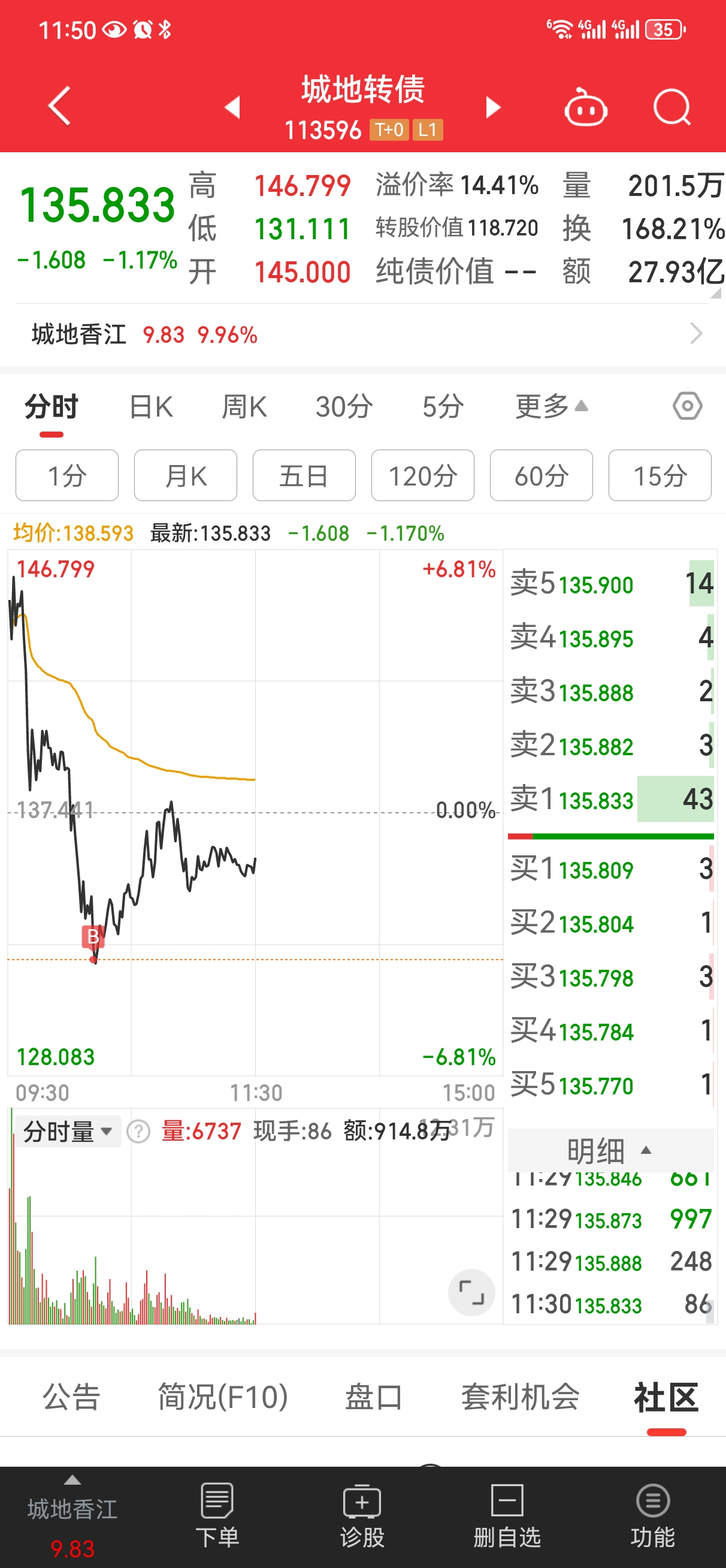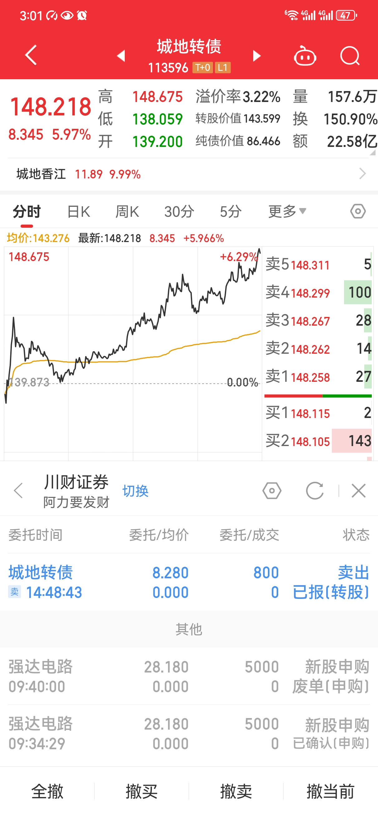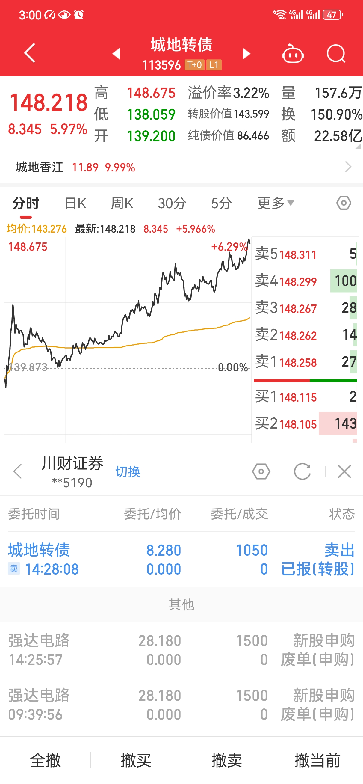 周一正股肯定破板,甚至翻绿,正股人人都看好,结局一定不一样。就好比去年的全筑,又是说党校,又是无人机,又是白酒,最后一地鸡毛。从转债走势就能看出,正股不可能一帆风顺,庄家也不可能傻到给周五转股的两亿抬轿子。别说都是庄家转的,问问身边关注城地的,转股的人大有人在。周一集合竞价就是跑路的最佳时机。