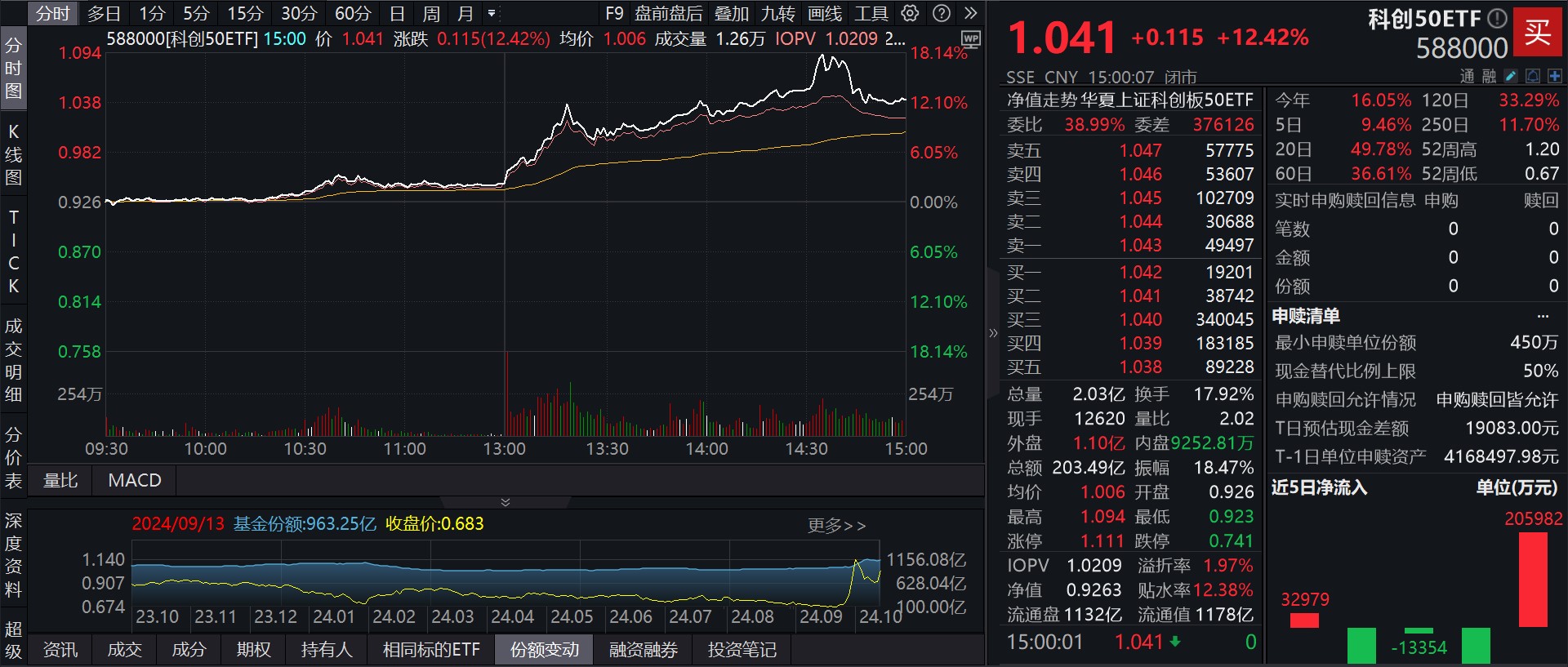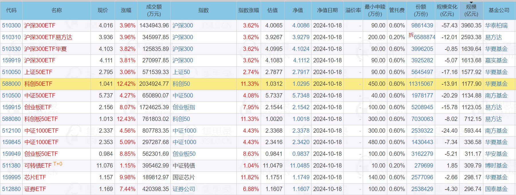 2024年10月18日,科创50ETF涨幅12.42%,溢价率1.12%,规模1177.90亿元。