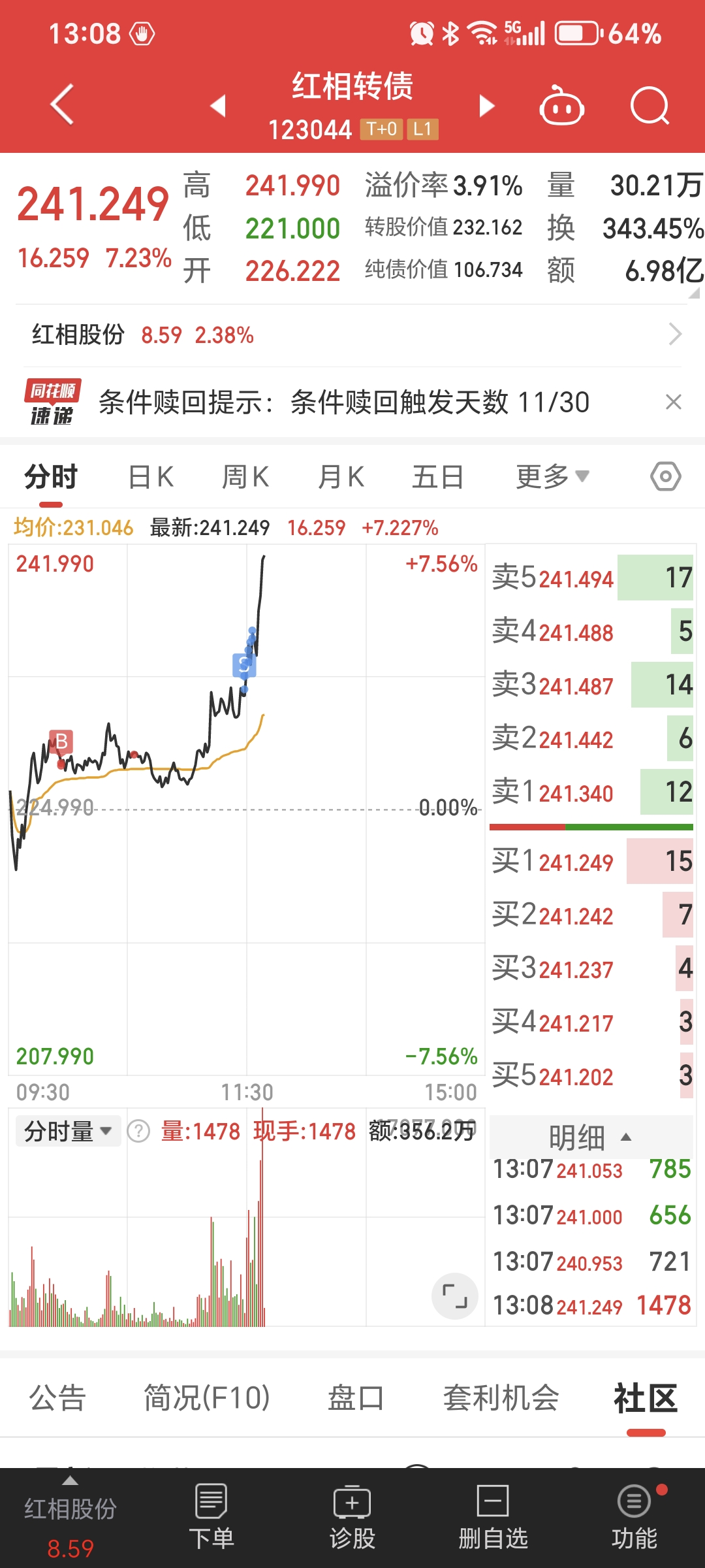 今天已经满足强赎,看公司怎么公告……其实不影响什么,毕竟溢价率在那,只看正股如何演绎了!