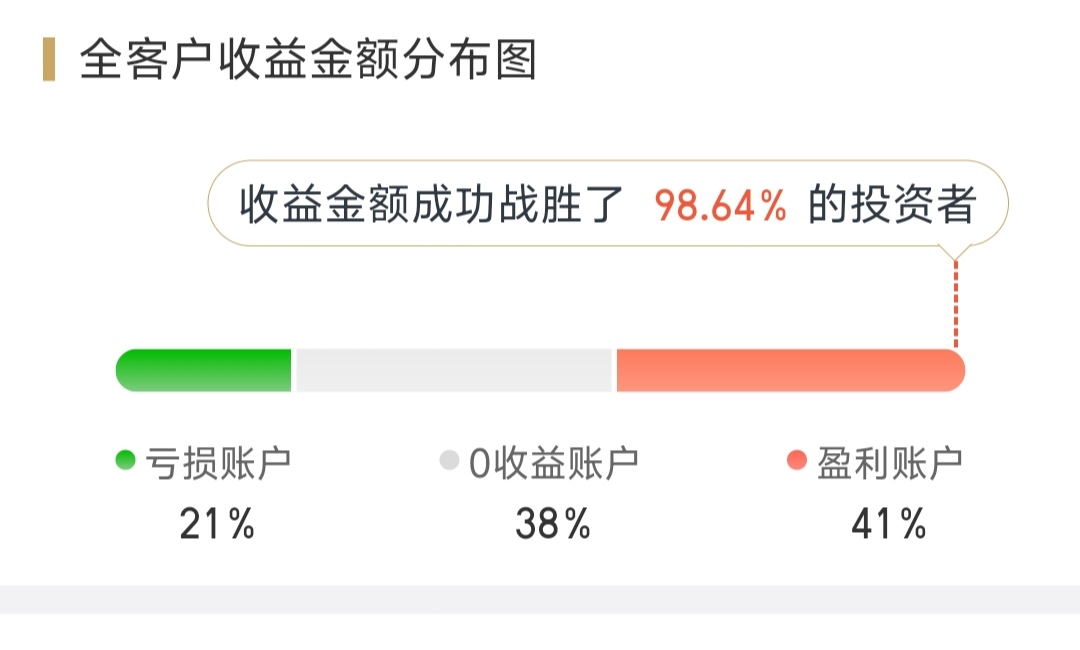 挨了一年打,几天就回血了,10月8日清了,歇一歇。心累为啥都是动不动放500万在里面玩高波动权益资产的大咖?那放低风险的部分还不得5000万,身家一个亿起步?你们为啥都赚了那么多钱啊?:)看大家生活这么好,真是得感谢政府。谁再说经济不好,收入都这么高