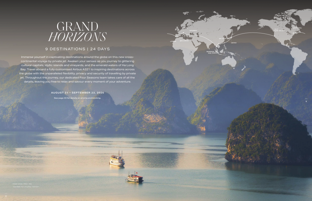 环球旅行这个概念,按照我的理解,是一趟旅行要绕地球一周。像航空联盟通常卖的环球仓商务套票,它就是需要一趟旅行同时横跨太平洋和大西洋,并回到同一目的地。但是,四季的环球旅行定义不一样,它是一趟旅行同时跨越三大洲就算环球旅行了。例如15天飞抵亚非欧三大洲,23天飞抵北美南美非洲欧洲。这种私人飞机之旅全程都是住在四季酒店,并有专属改造的四季私人飞机,很豪华,但是并不是我们平常见到的公务机那种私人感,更像一个全部商务舱的飞机。安缦酒店这几年也购入了专属飞机,也有同类型的安缦环球之旅,价格比四季的还便宜一点点。他们的特色就是可以在没有常规航班线路的时候自己设计专属航路,例如从不丹直接飞马尔代夫,用最少的时间和最舒适的方式实现从顶级雪山到顶级海岛,全程很舒适的打卡各个景点。这种产品15天的话,一般单人费用大概在100万人民币左右,23天产品可能在150万人民币左右。当然,这种顶奢产品服务的是塔尖人群,两人玩二十多天三百万,我肯定是不会买的。但是这个产品于我这种时间自由的低风险投资者而言,其实是很有研究价值的。我的目标是花百分之1.5至百分之2的费用,实现百分之50的享受。下面我来谈谈我对这个的理解和优化。