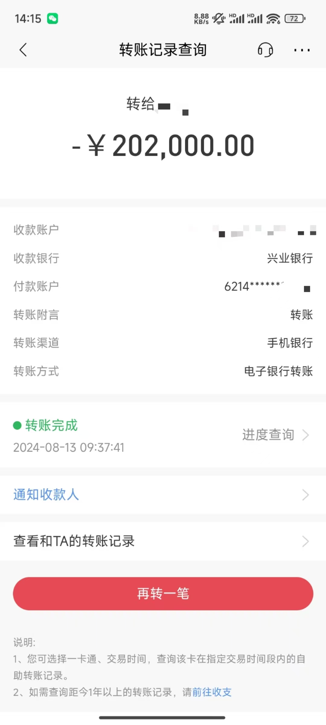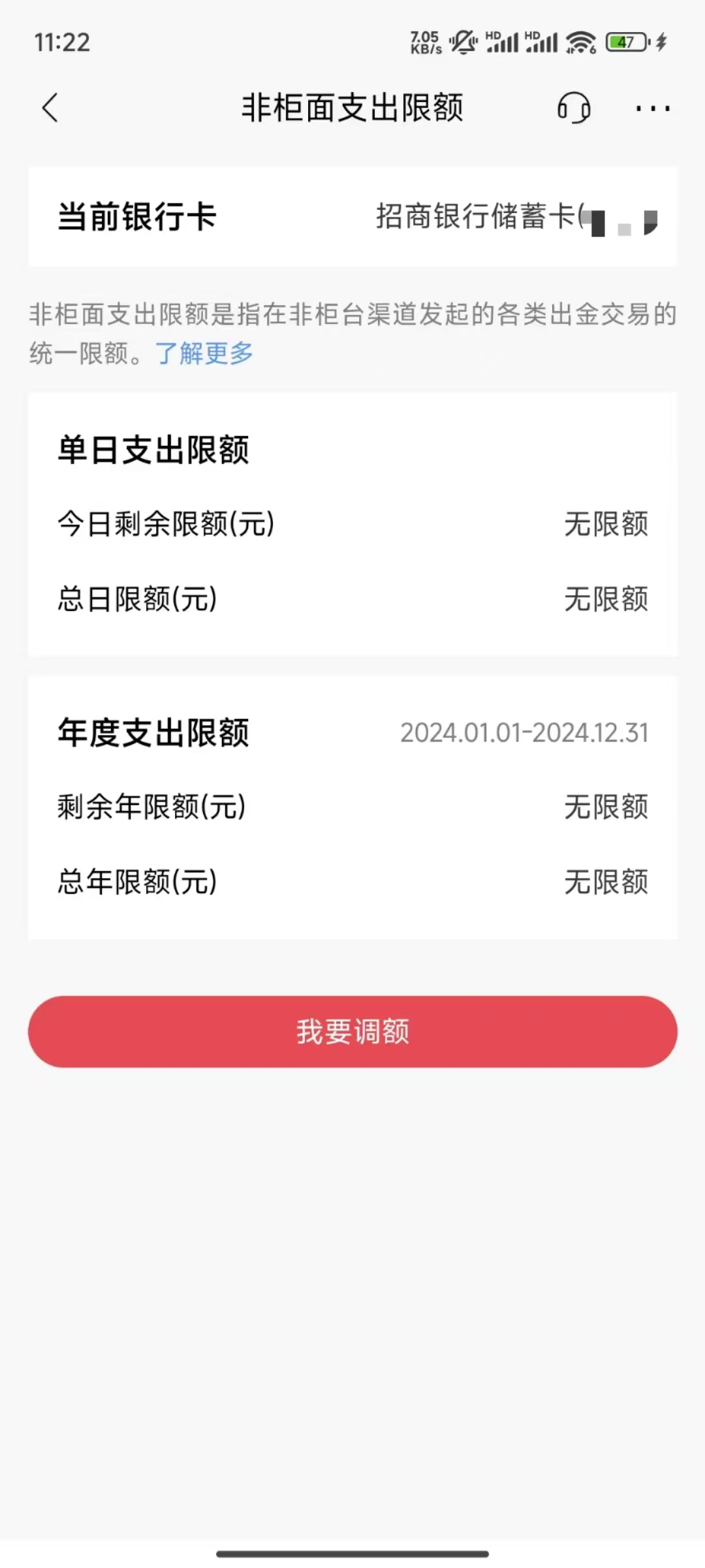 我的日转账限额是自己设置的,年转账限额是13个9,有生之年应该触发不到了吧。差一元就10万亿了。两市成交两周就够了。嘿嘿!