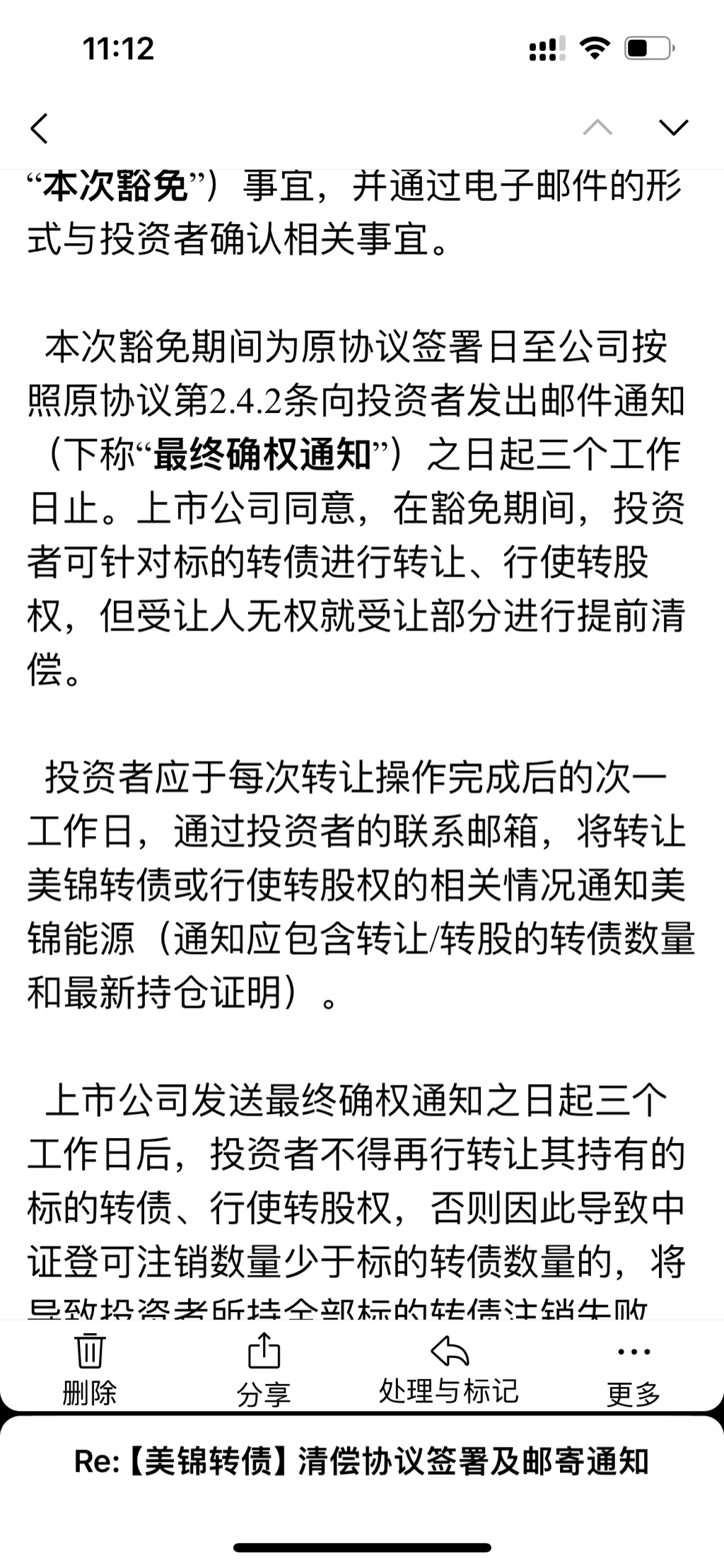 (4)现在美锦转债溢价率低,大家有清偿资格的,千万不要轻易的卖出或者作T,恶心的公司曾发邮件给投资者,卖出部分就失去全部清偿资格。