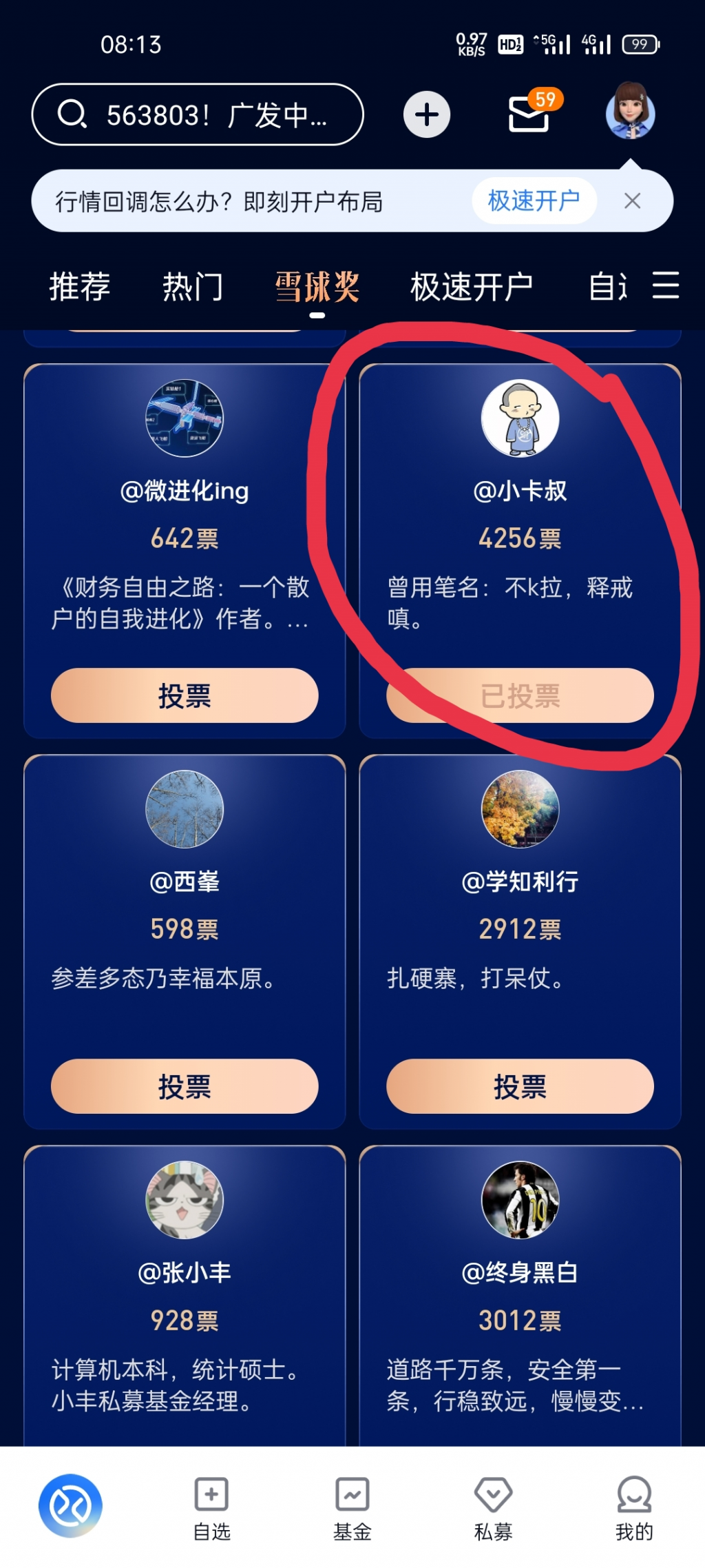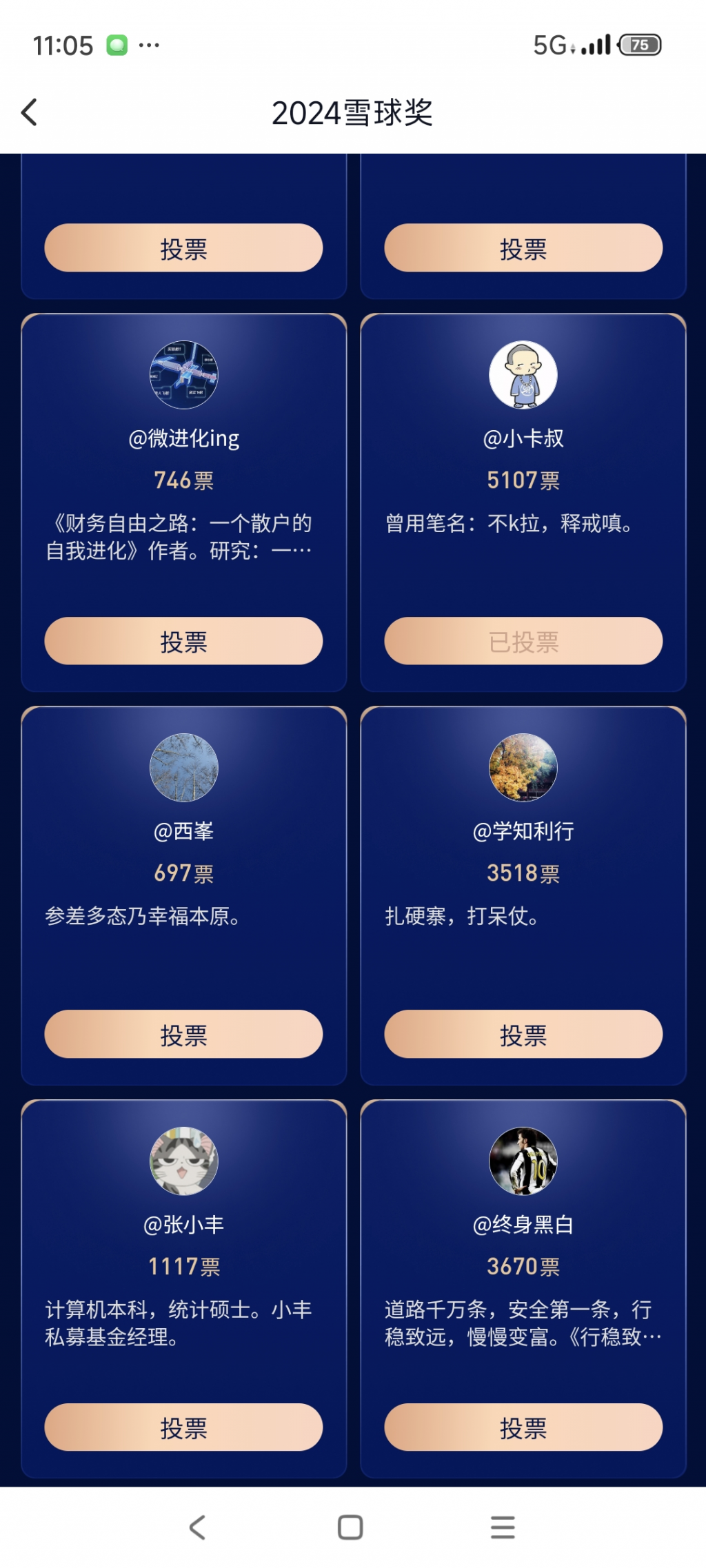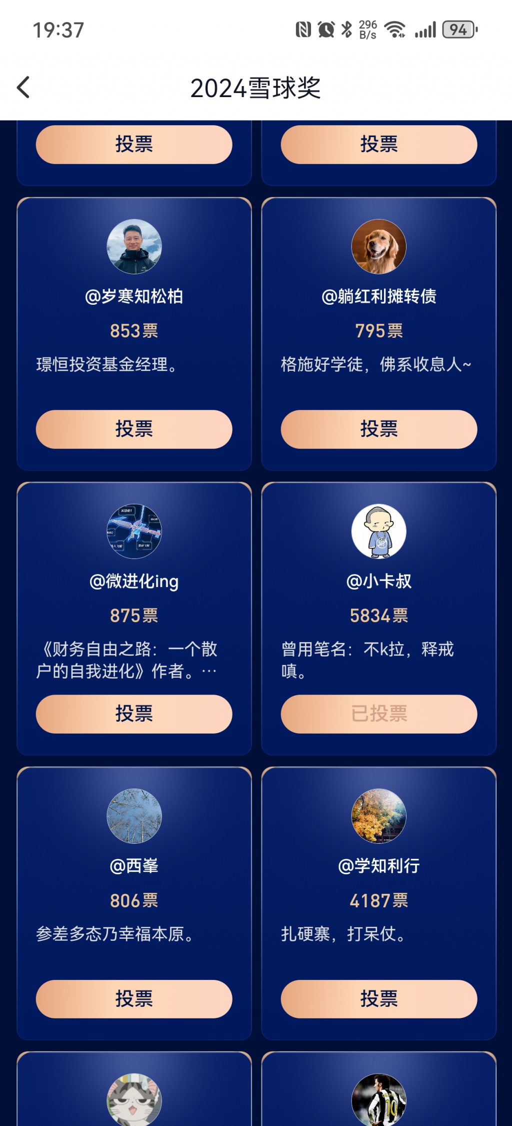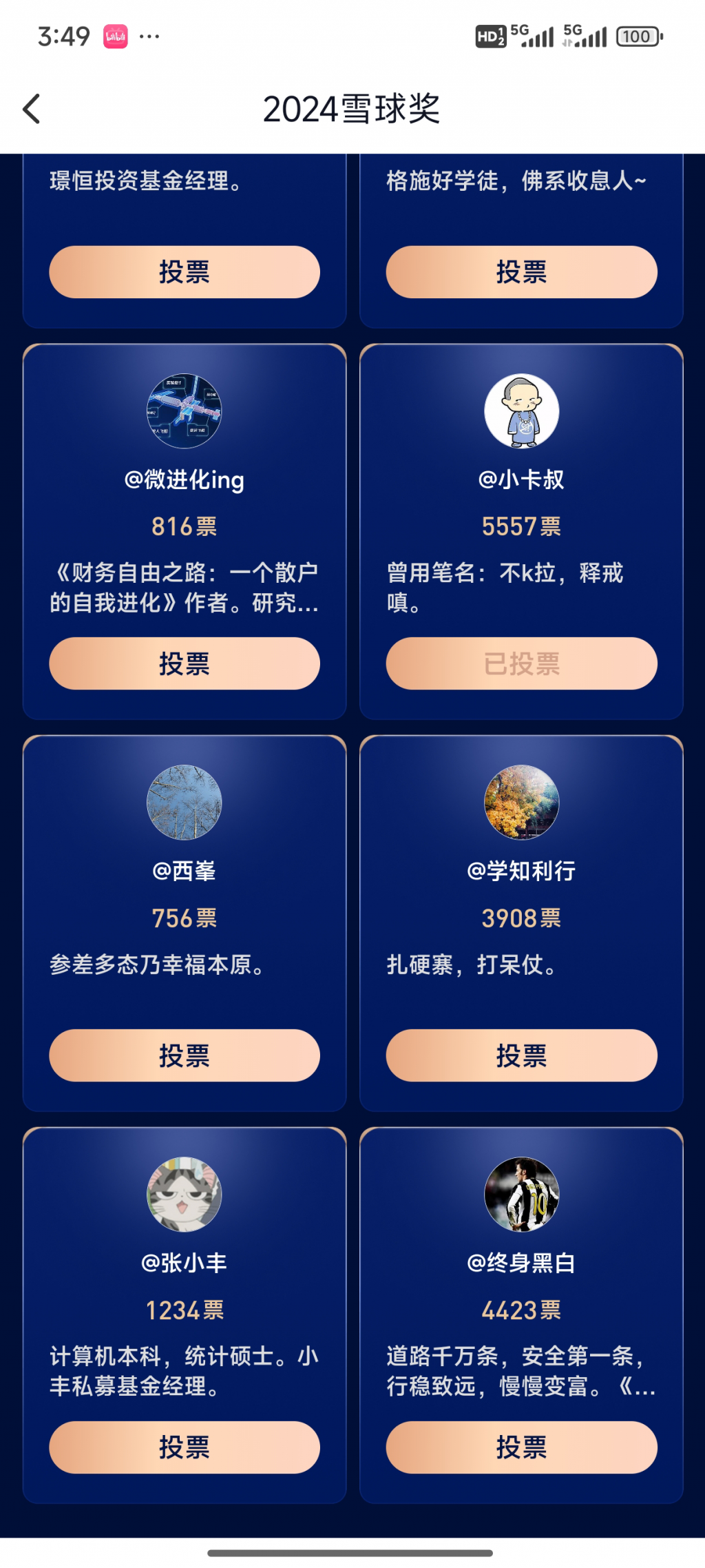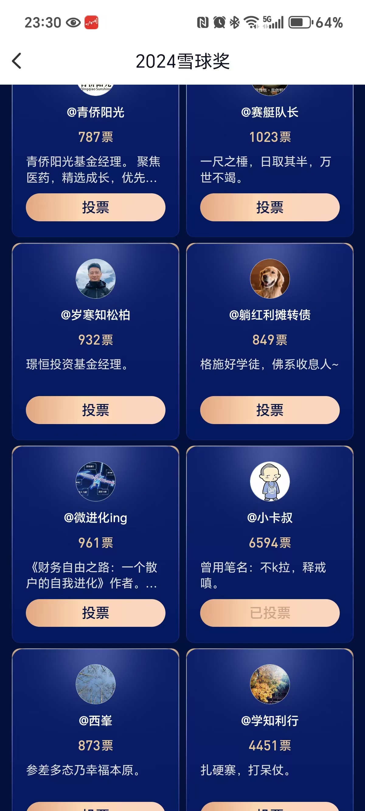 https://xueqiu.com/snowball-activity/festvial2024(提名是按照ID拼音的顺序,所以十大影响力的提名名单,需要拉到最后一页,才能看到卡叔的名字。)