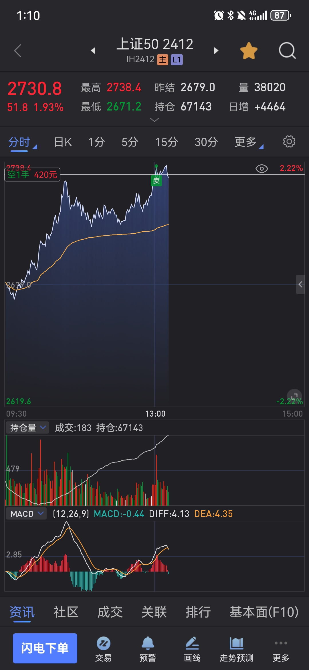 根据我的经验,楼主在开空不到10分钟已经买多对冲了。