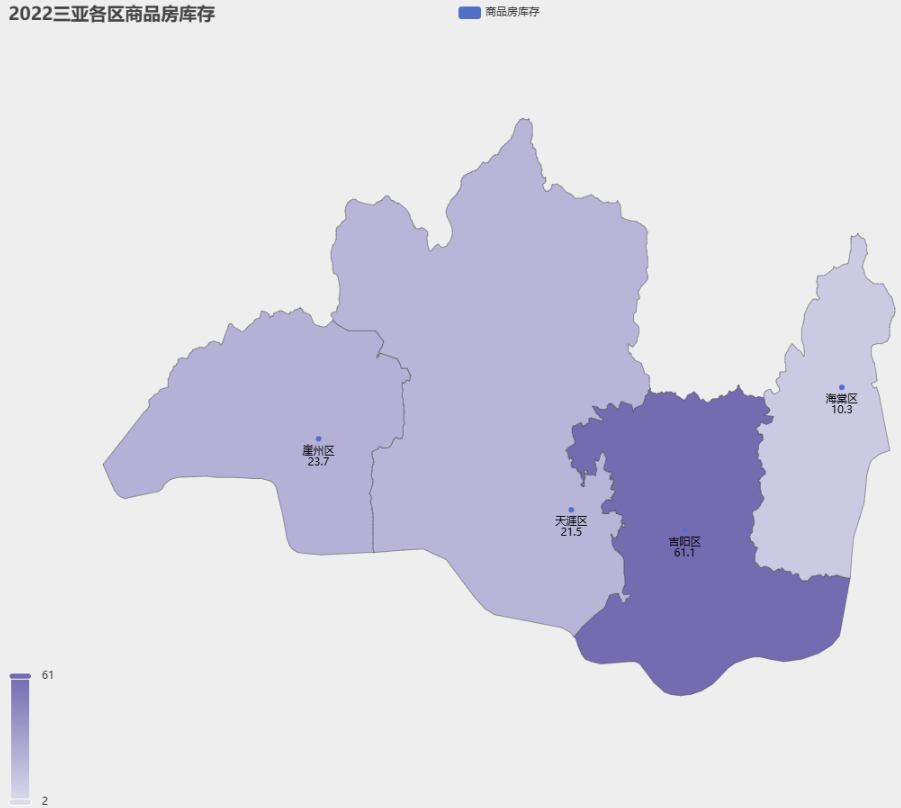 三亚商品房库存:吉阳区最多61.1万平米,海棠区最少10.3万平米。