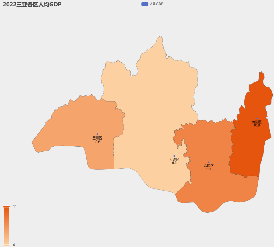 三亚人均GDP:海棠区最高11万,天涯区最低6万。
