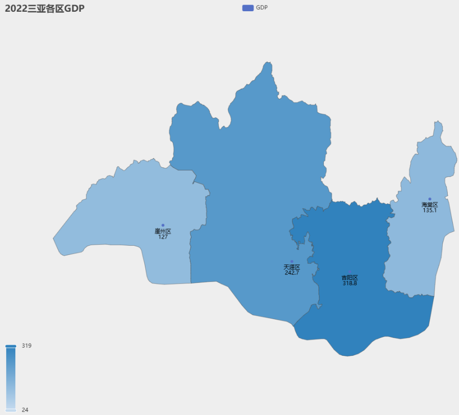 三亚GDP:吉阳区最高319亿,崖州区最低127亿。