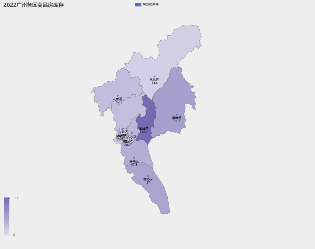 广州商品房库存:黄埔区最多11673万平米,越秀区最少289万平米。
