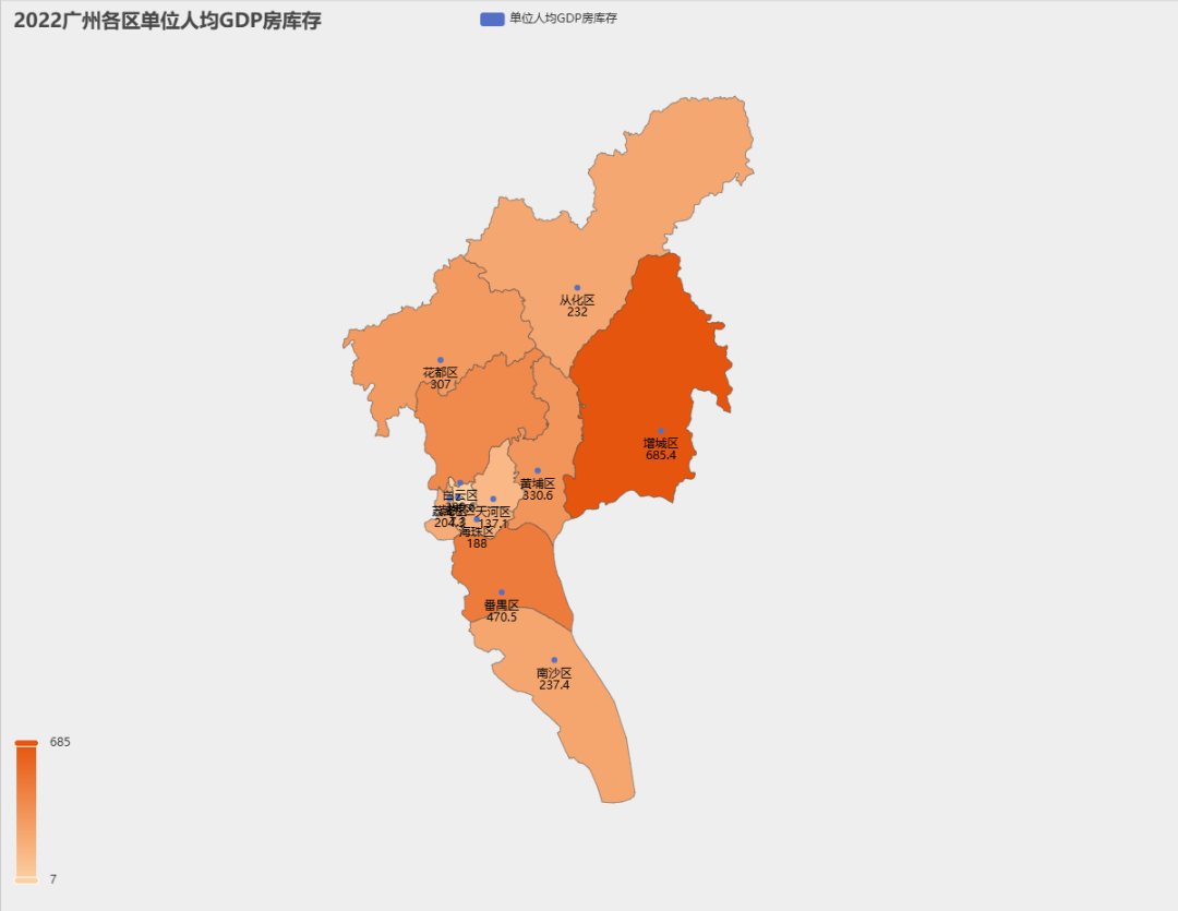 广州单位人均GDP商品房库存:增城区最高685.4平米,越秀区最低7.3平米。